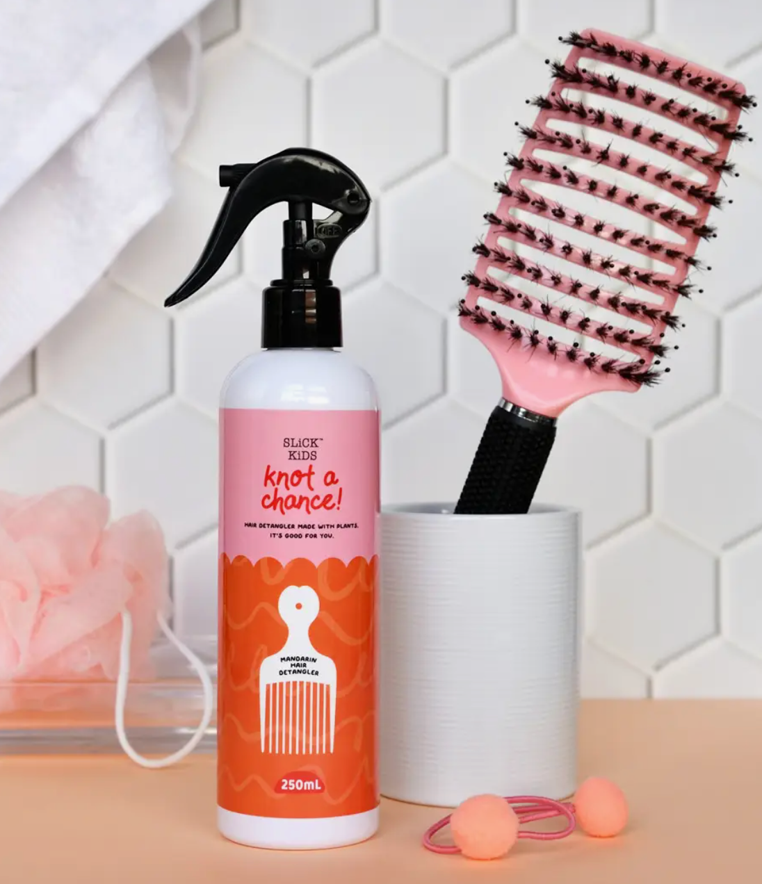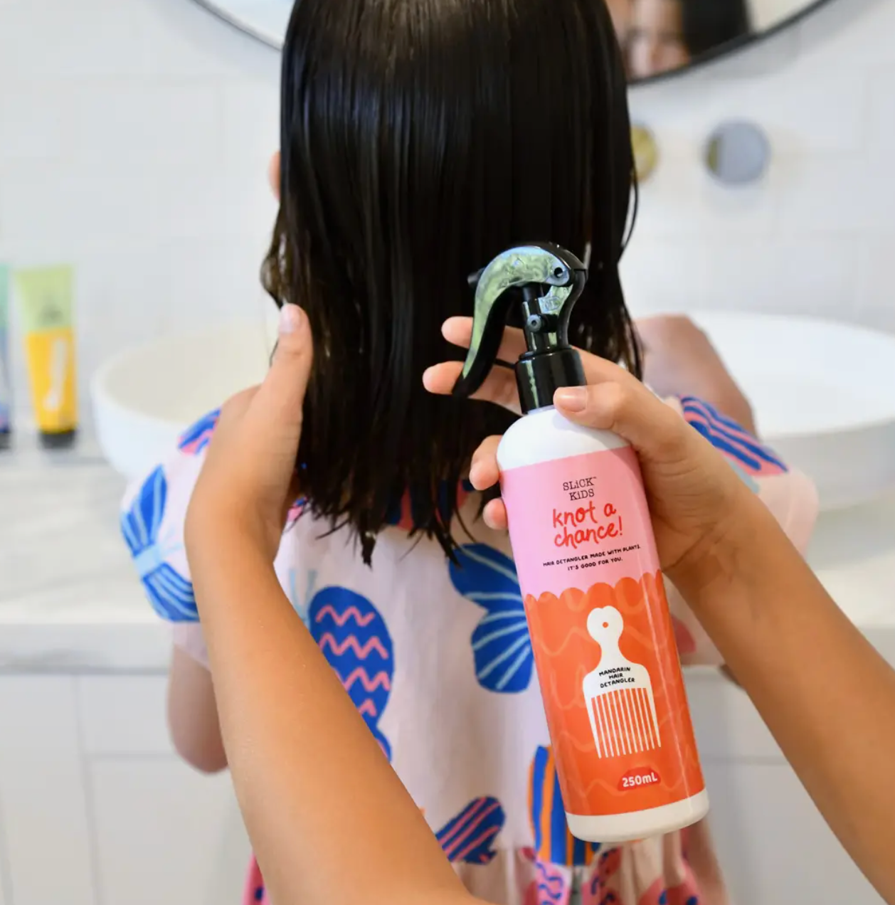 SLiCK KiDS™ natural/plant-based detangling spray will allow your brush or comb to run smoothly through your hair, ensuring no more breakages and no more tears. Native Australian Emu Apple extract provides natural conditioning and hair detangling properties while calming, soothing Chamomile extract imparts brightness and shine. Enjoy an invigorating scent of fresh Mandarin and sweet, juicy Grape.