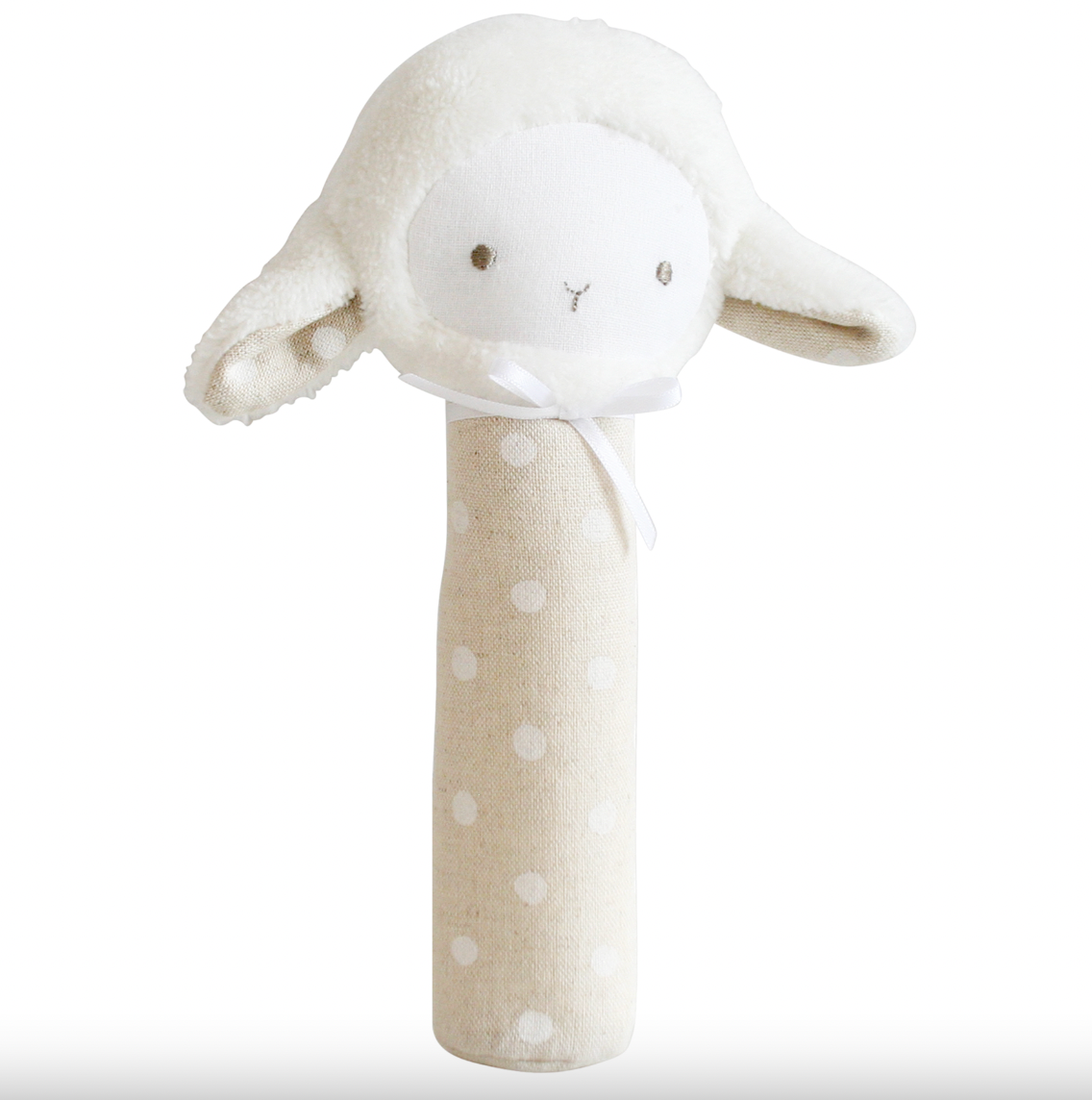 A cute lamby hand squeaker toy. Squeaks easily when gently shaken or squeezed. A beautifully made safe toy that is perfect for young babies to explore their grasp reflex from birth & then later at around 4-5 months they are delighted by the squeaking sound & will learn to squeak independently by watching you. Squeakers are a great distraction toy! An absolute must-have in the baby bag!