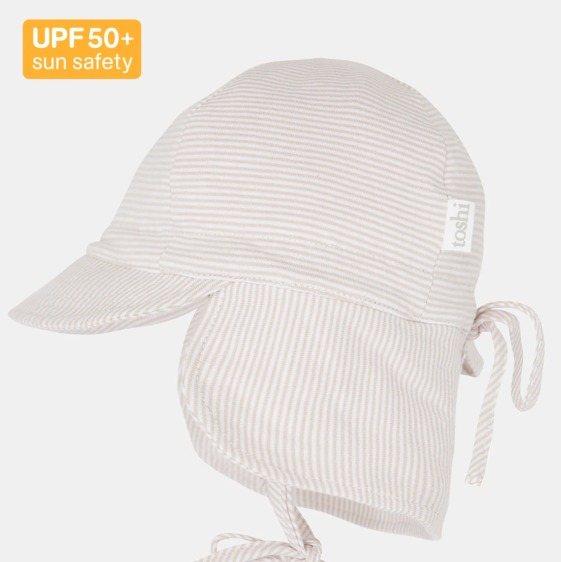 Flap Cap Baby is an iconic Toshi baby sunhat. The UPF 50+ UV rating indicates maximum sun protection. Shielding precious babies from the elements is the primary focus in the creation of this sunhat. The Toshi Flap Cap has a contoured neck flap for enhanced sun protection. A head tie creates adjustable sizing and the chin tie secures the cap. The cap is fully lined for increased comfort. Made from the finest quality cotton knit, the baby Flap Cap is gentle to wear, functional and practical.