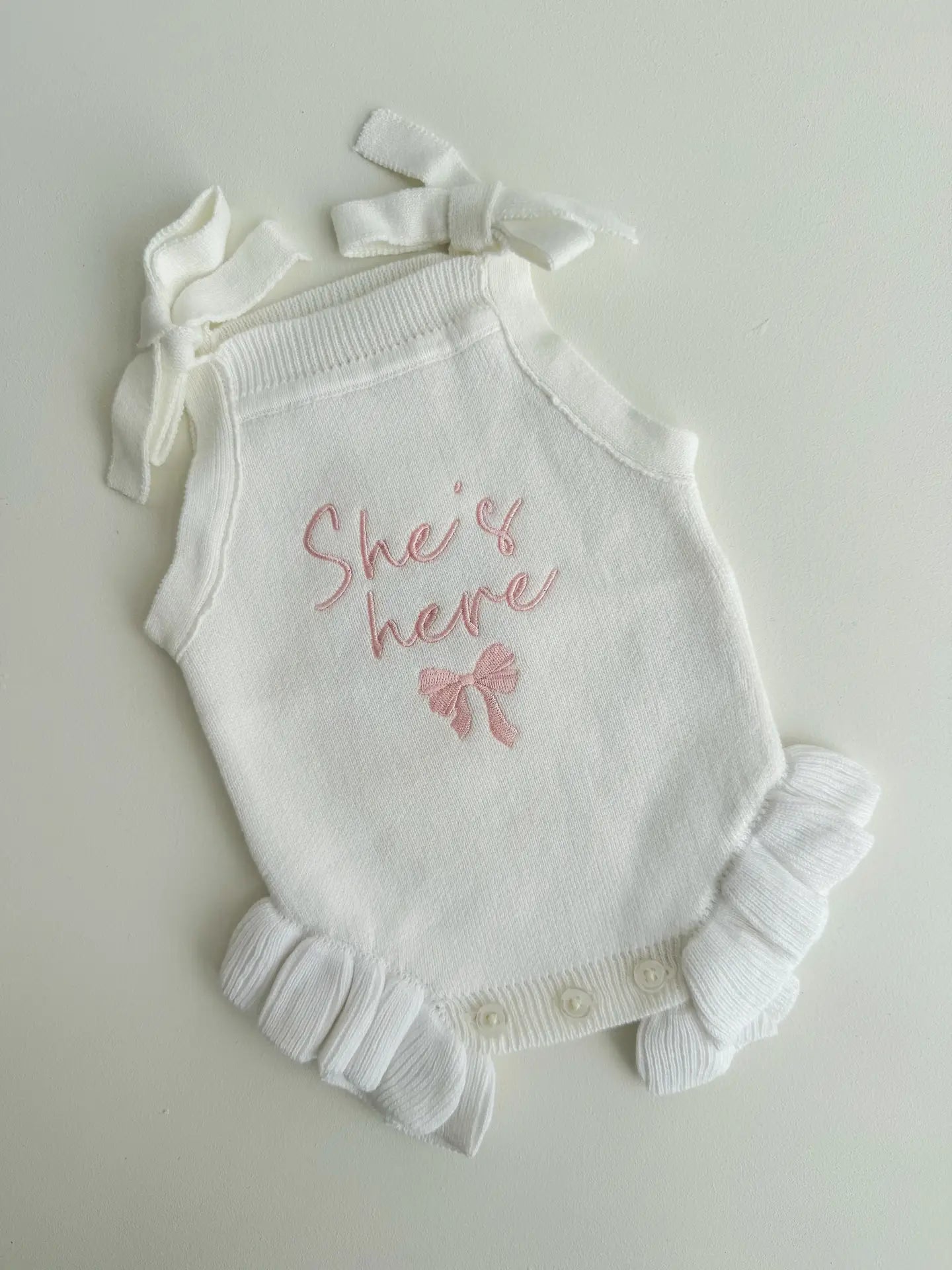 Tie Frill Romper, Milk with She's here Bow embroidery