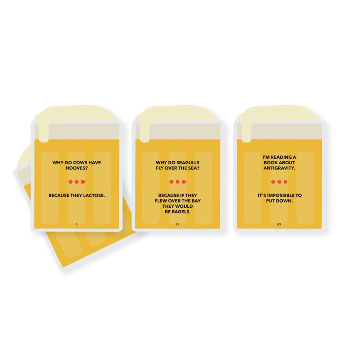 The 100 un-beer-able jokes are printed on beer shaped cards and come packaged in a novelty beer shaped box.