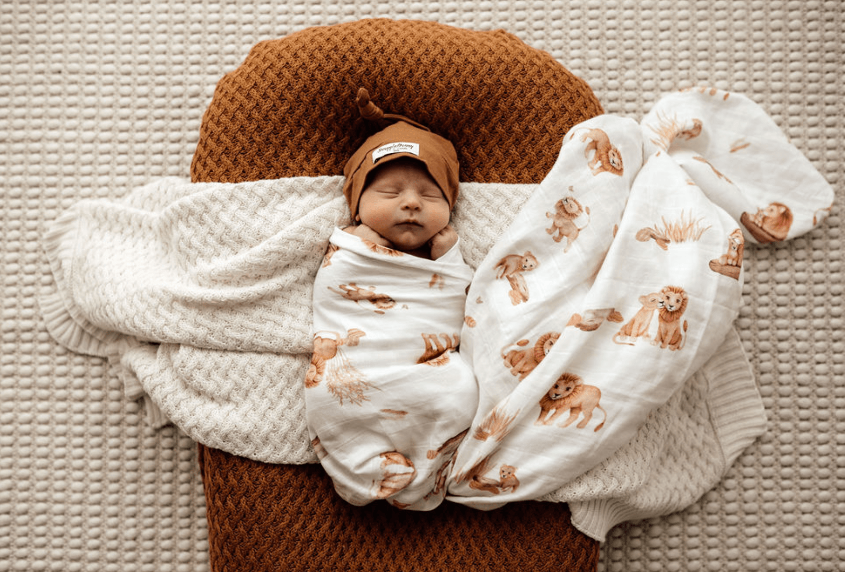 Our soft multi use lion baby wrap is made from the finest quality Organic Cotton Muslin. Designed especially for our very own Snuggle Hunny Mama & Baby.