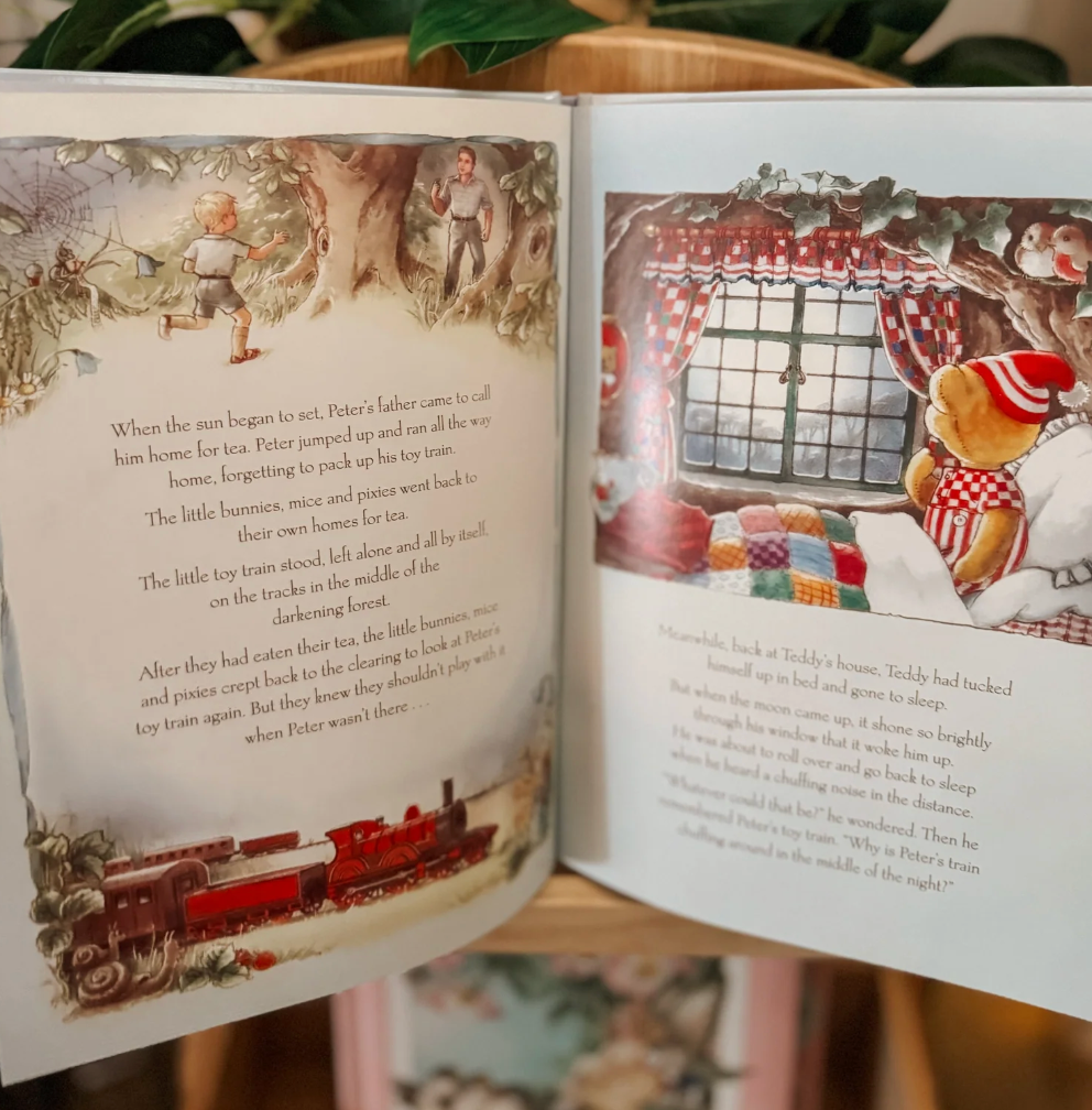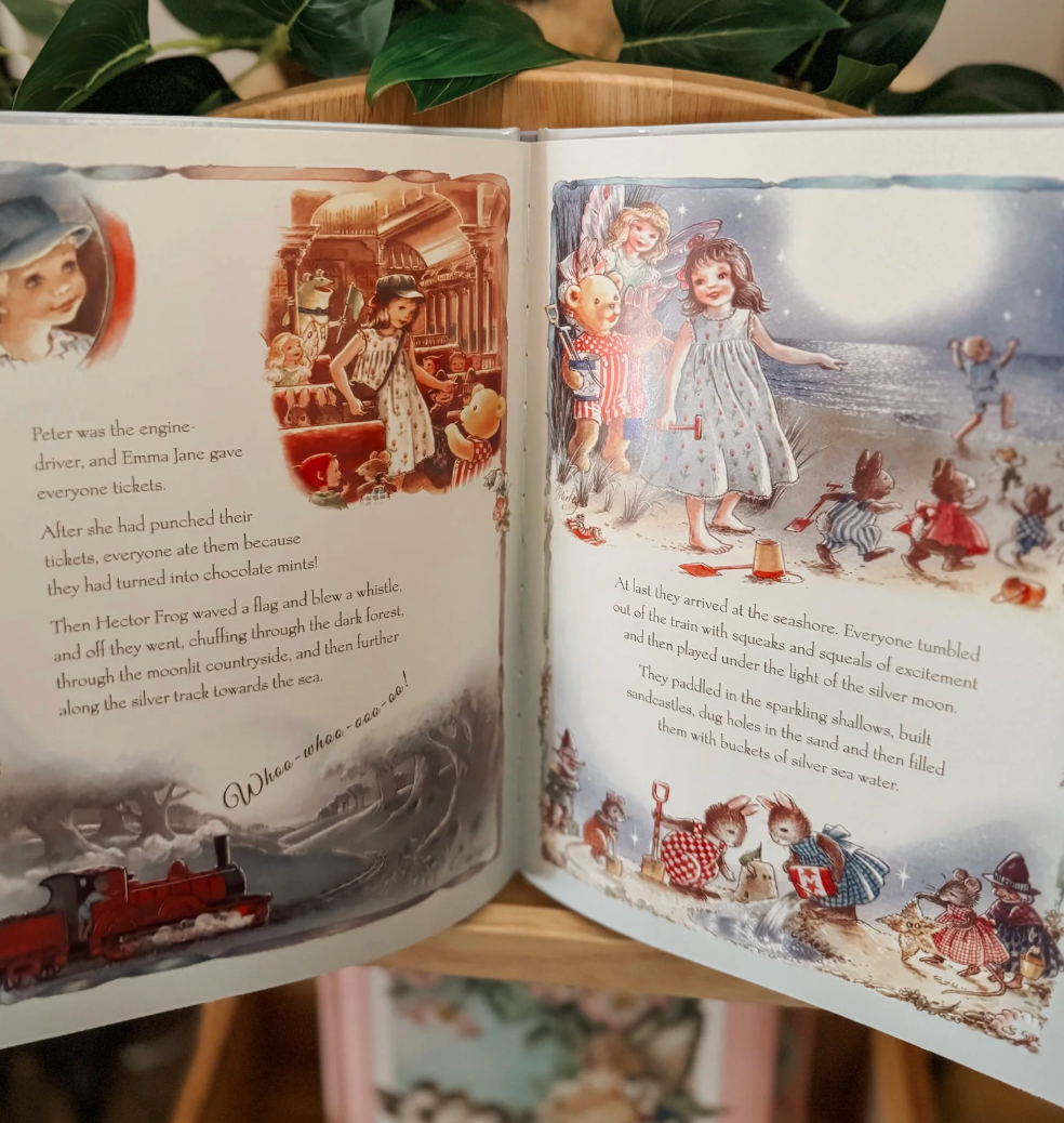 In this gentle woodland tale original to Shirley Barber, The Moonlight Train Ride follows Teddy and his friends on a magical evening adventure aboard a little train that chugs through the forest as the moon rises. Set in Shirley Barber's cozy, beautifully illustrated forest world, the story captures the excitement of a nighttime journey, with fireflies flickering, soft sounds of animal friends tucked in for the night, and the gentle glow of moonlight along the way. The friends share laughs and a sense of wonder as they watch the world transform under the silvery light, making this ride a special experience of friendship, curiosity, and the simple joys of being together in nature . . . a reprint of the gorgeous nostalgic Teddy's Forest Friend series that will wrap you up like warm cozy blanket.