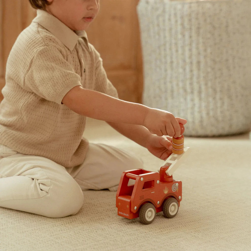 Fire brigade ready! Extinguish the fire and save the day with this sturdy wooden fire truck. The movable ladder helps with every rescue mission, while the rubber wheels ensure a smooth ride. Help animals out of tall trees and make sure everyone is safe. The set includes a brave firefighter who is always ready to help. Perfect to combine with the fire station for even more action!
