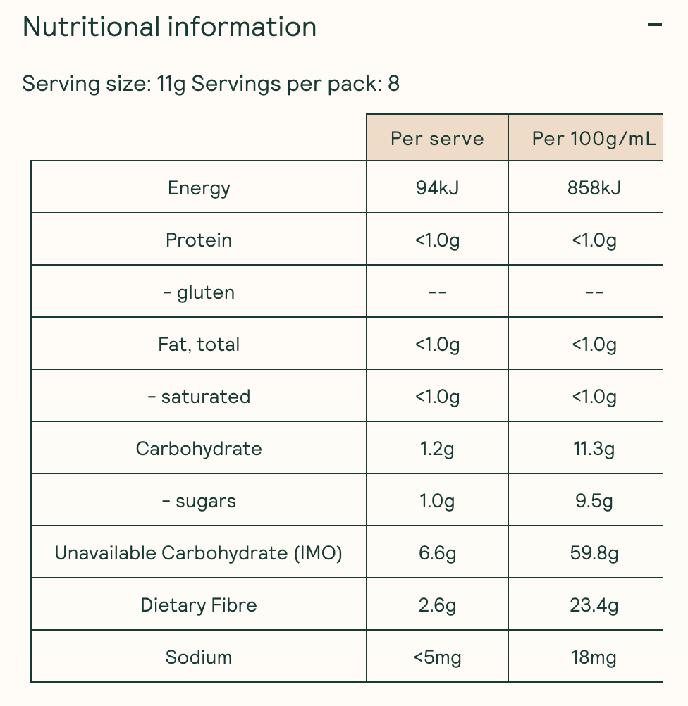 Soluble Fibre from Tapioca Starch (IMO), Chicory Root Fibre, Food Acids (Citric, Malic), Natural Flavours, Natural Colours (Concentrates of Carrot, Apple and Blackcurrant, Tumeric, Spirulina, Caramel I), Sweetener (Steviol Glycoside).