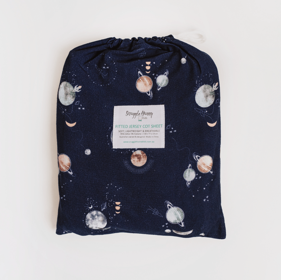 Our Milky Way Fitted Cot Sheet is made from snuggly soft stretch cotton jersey. Comes with a matching drawstring storage bag which can be used for other multi-purposes.