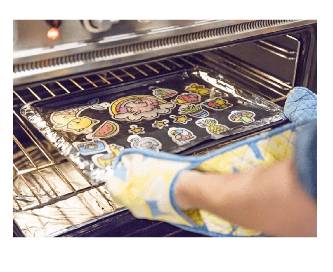 5. Bake in the oven for 2 minutes — Shrinkie will curl up as it shrinks before it flattens out again