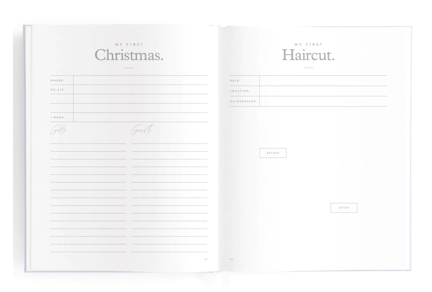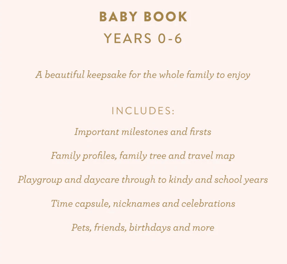 A beautiful keepsake for the whole family to enjoy. Includes: important milestones and firsts, family profiles, family tree and travel map, playgroup and daycare through to kindy and school years, time capsule, nicknames and celebrations, pets, friends, birthdays and more. 190 pages.