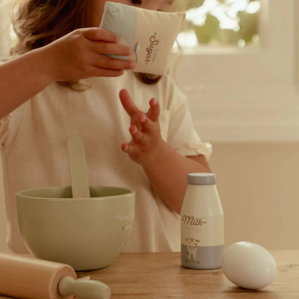 Time to bake something delicious! With this wooden baking set, little bakers can learn all about preparing tasty cookies and pastries. The set includes a recipe card and all the essentials, such as a mixing bowl, a baking tray with cookies, toppings, an egg, butter, flour, sugar, milk, and even colorful sprinkles. Roll out the felt dough with the rolling pin and decorate the cookies as desired. The perfect set for endless fun in the play kitchen!