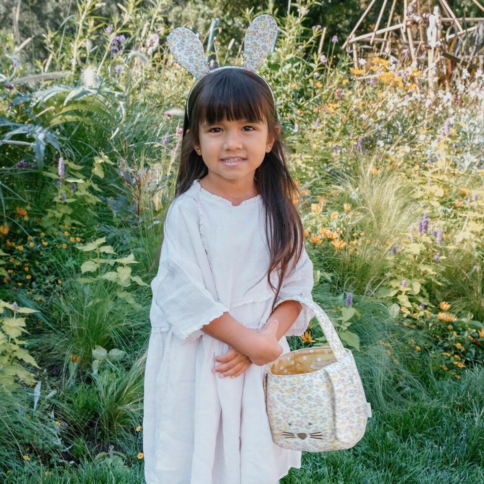 Hop like a bunny with this beautiful bunny headband, topped with two beautiful petal printed bunny ears.