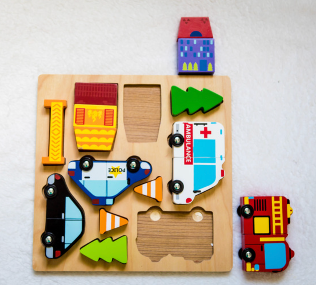 What adventure will you go on? A bright chunky car puzzle with emergency vehicles where the cars can be mixed and matched with magnetised pieces. The puzzle opens up a world of open-ended play with wooden trees, cones and buildings. The design includes fantastic solid shapes for young hands to manipulate. Puzzles are a great opportunity to grow your child's gross and fine motor skills, hand and eye coordination, problem-solving, shape and colour recognition skills.