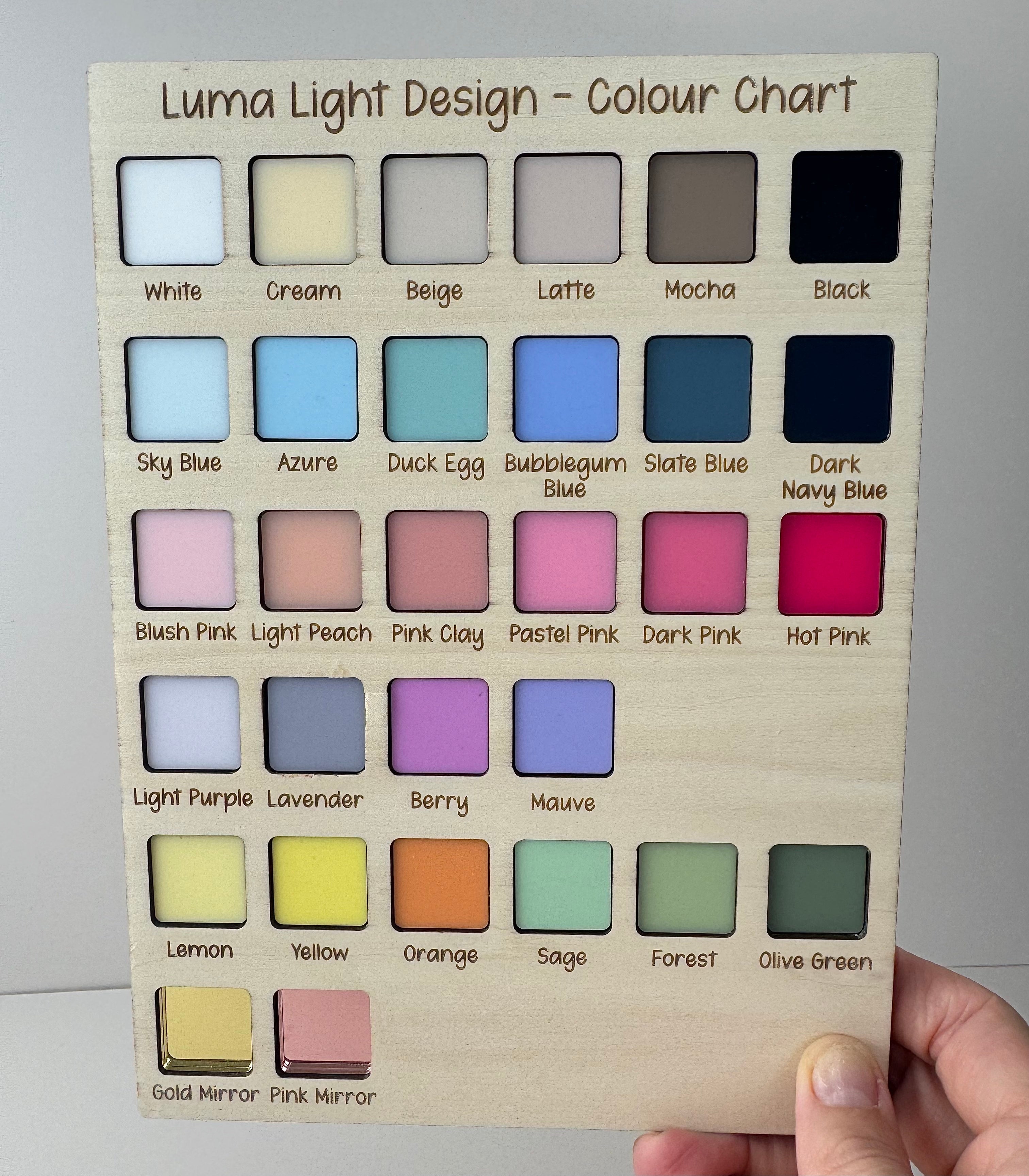 If you would like different coloured acrylic/s on your item please refer to our colour chart in the photos. Please put what you would like in the notes upon checkout. If no notes are left the item will be made as per the example design