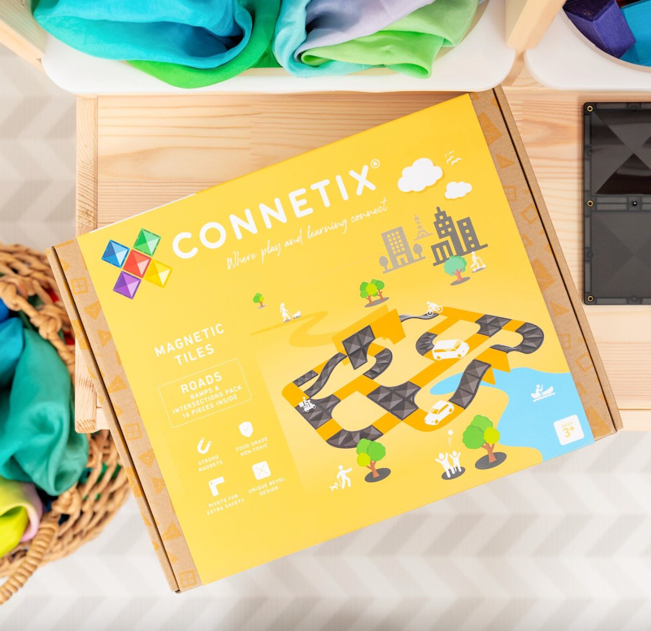 The 16 Piece Roads Ramps and Intersections Pack features exclusive road-inspired magnetic tile shapes including quarter circles, arches, intersections and ramps, all in a sleek black shade. Designed to fuel endless construction adventures, this pack elevates the creation of skateparks, racetracks, and even rollercoasters as you build again and again. The purposeful introduction of black tiles enhances the visual of roads, ramps, and runways, while the exclusion of white lines and road markings maintains the open-ended nature intended by CONNETIX products, allowing children to reimagine pieces into their own creative builds.