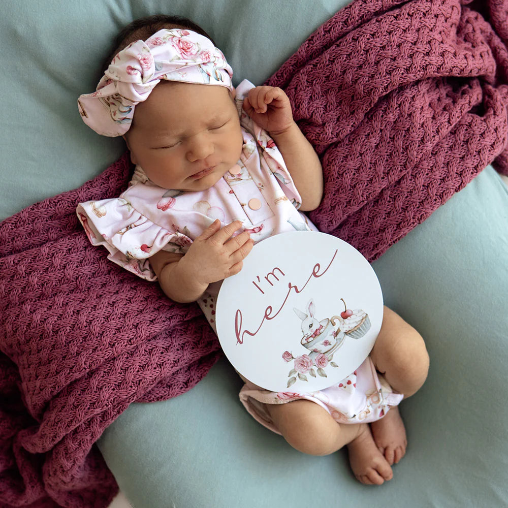 This pack contains 25 Reversible milestone cards that coordinate with our Tea Party organic wraps and clothing.