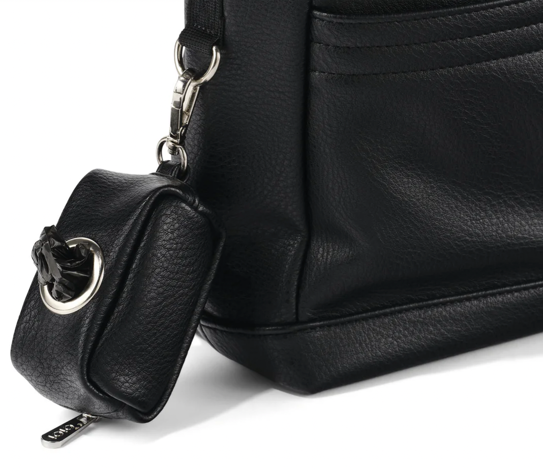 • Easy to clean premium vegan leather • Water resistant lining • Includes clip to attach to your bag • Large eyelet for dispensing disposable bags • Zip opening