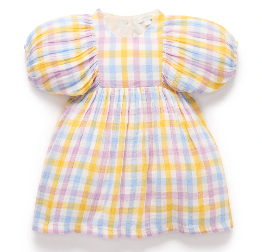 Our Check Gathered Dress is a great, lightweight summer style! Featuring a colourful all over gingham pattern, gathered skirt and puffed sleeves. Made from the softest 100% Organic Cotton muslin making this dress a light and breathable style for those days out in the sun. Style with our matching bow headband.