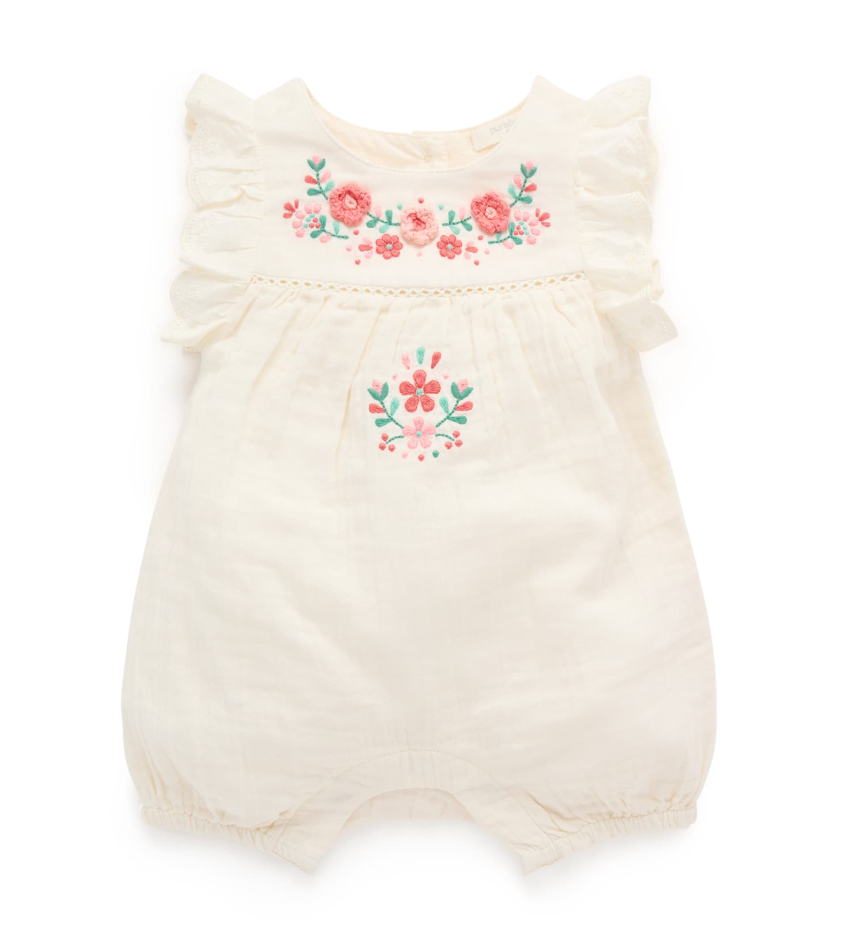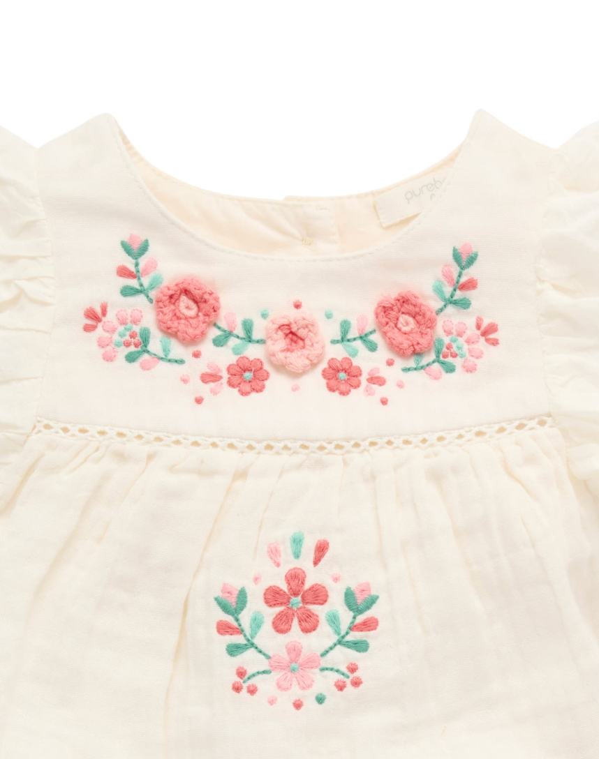 Flutter sleeves with broderie anglaise details Crochet and embroidered florals at the chest Balloon style Snap clips at the back and leg for easy dressing