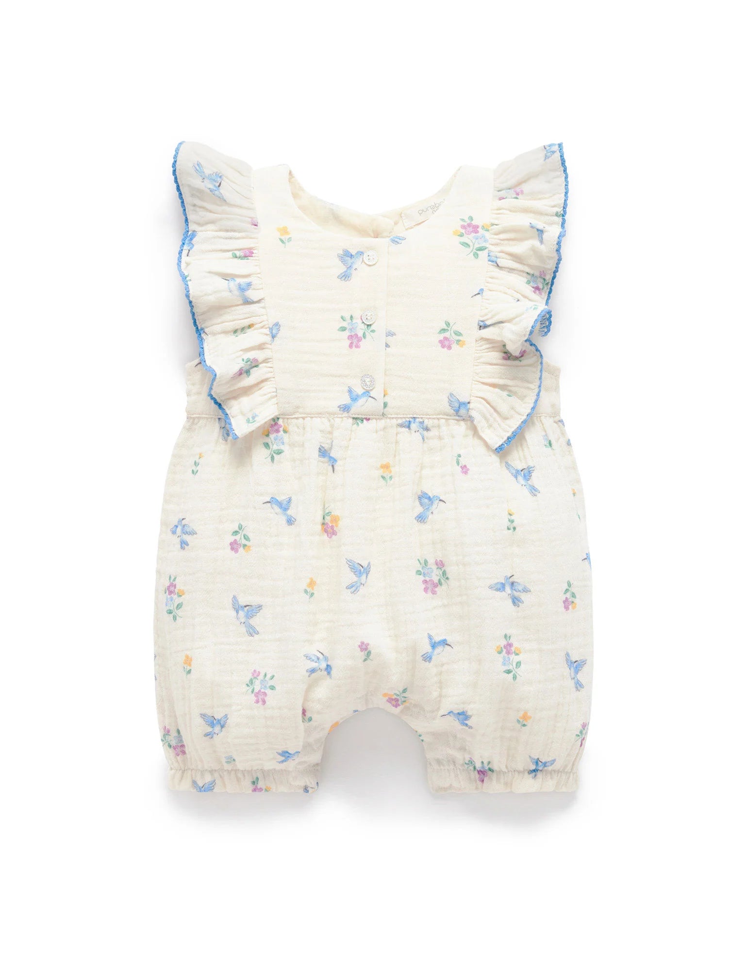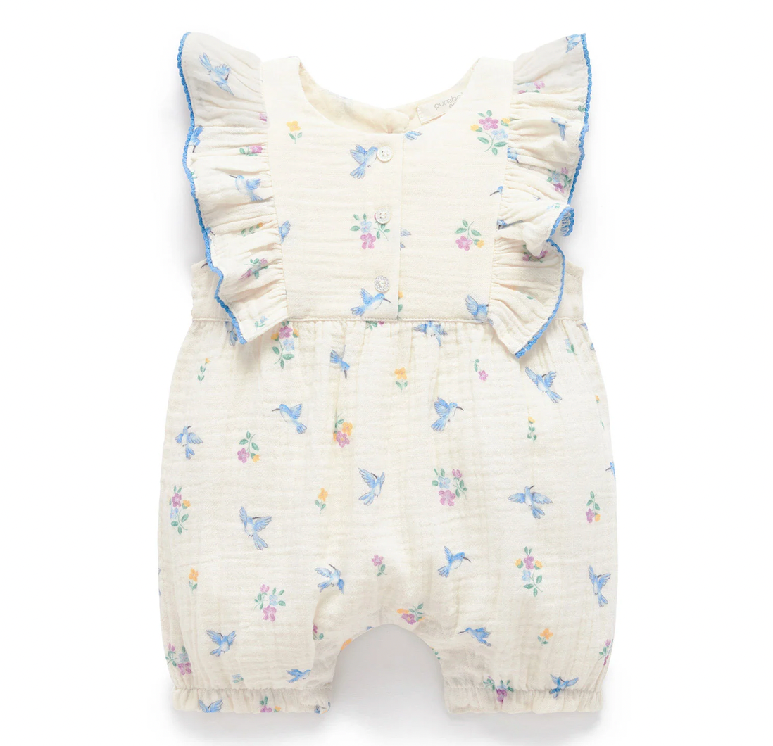 Our Hummingbird Ruffle Romper is the perfect lightweight summer style. Featuring sweet ruffle trimming at the shoulders and an all over floral and hummingbird. Made from 100% Organic Cotton muslin for a soft and breathable style.