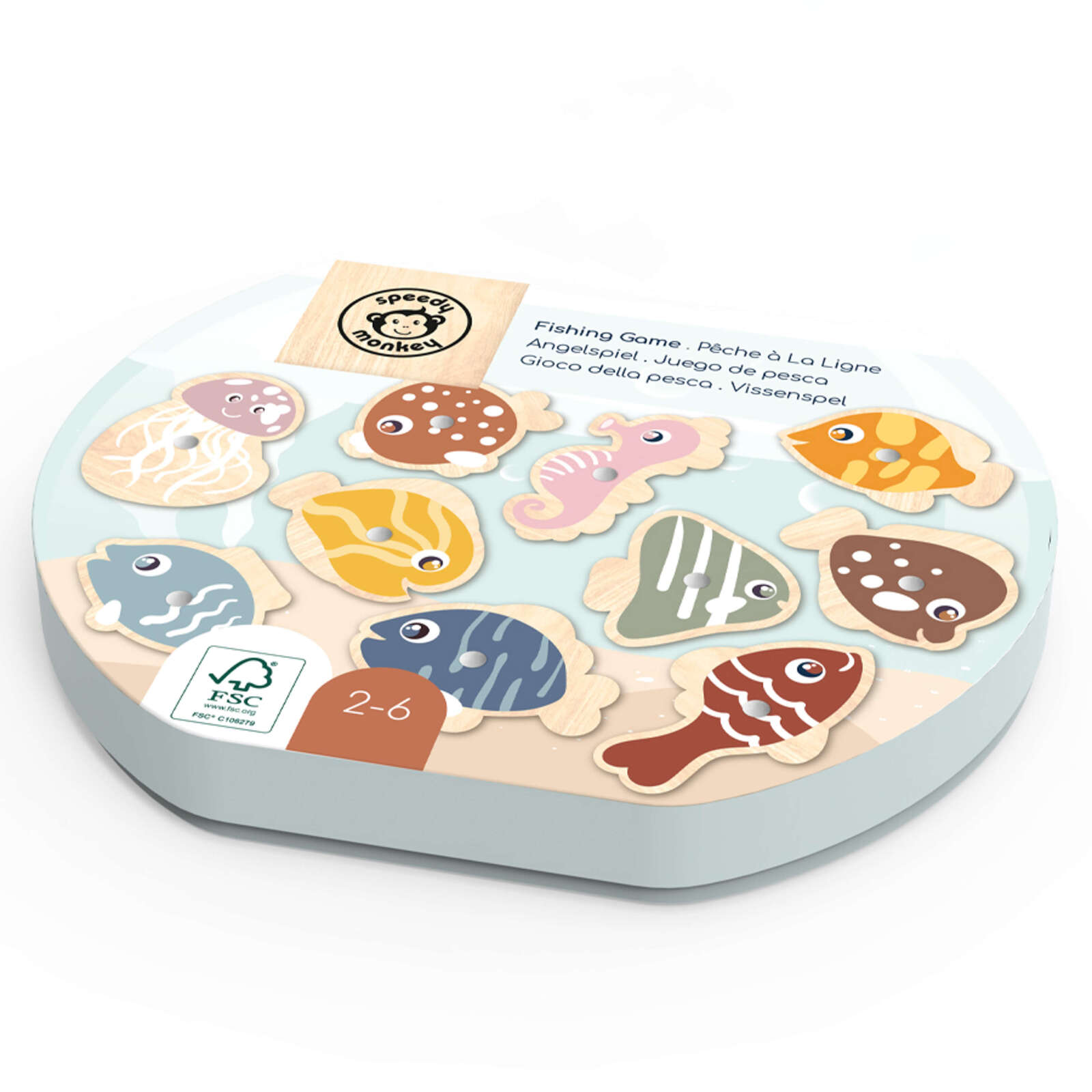 Time to go fishing? Grab your fishing rod for a fun time! These colourful wooden fish can be hooked up by the magnetic wooden rod and once safely attached, lowered back onto the board. Requiring skill and concentration to catch each fish. This Helps to develop dexterity and co-ordination. This toy is crafted from sustainably sourced wood from FSC® certified forests and coated with non toxic paint.