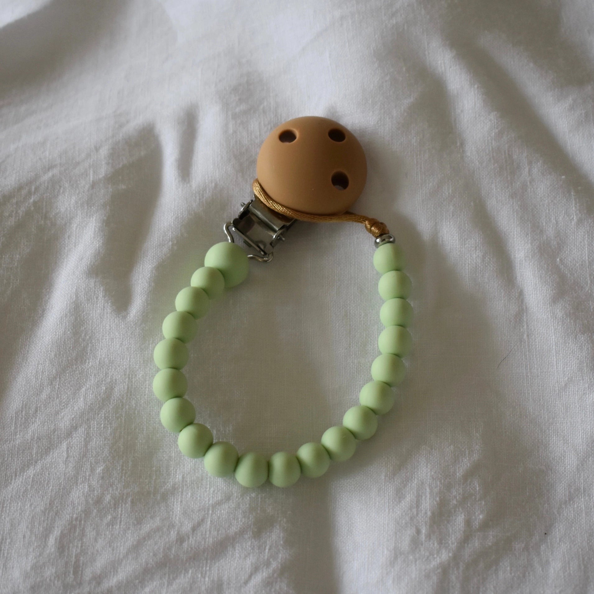 Made with easy-clean silicone & stainless steel beads on a tough satin nylon cord, our dummy clips are perfect for drooly, grubby bubs - simply wipe down with a damp cloth or baby wipe and air-dry!