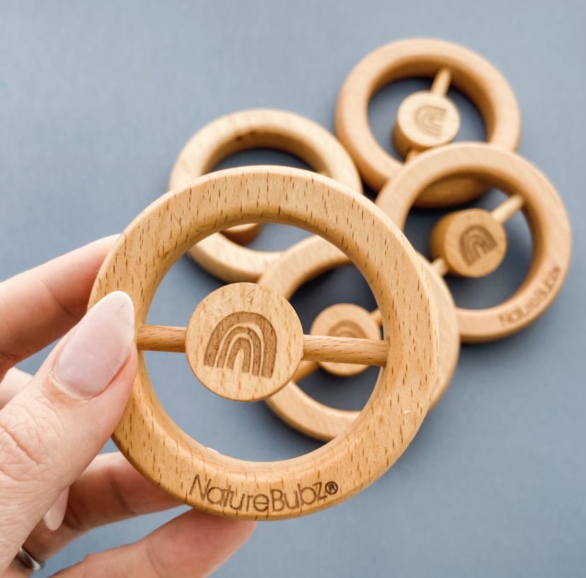 Our original engraved PHOENIX teething rattle is made from hard, impact resistant beech wood - ideal for when baby needs a hard surface to chew on to help the teeth break through the gum surface!