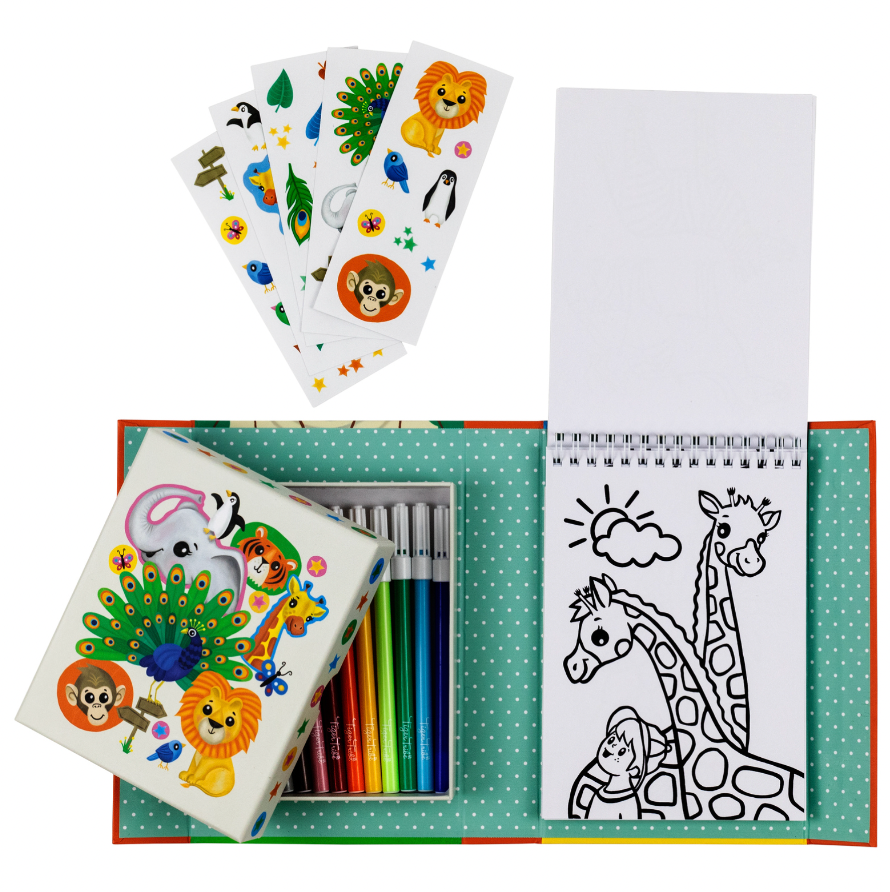 Add stripes to the zebra, invent a new species of snake or add some colour to the tigers while discovering elephants, giraffes and other famliar zoo animals, and maybe even some new ones! This imaginative colouring set includes ten vibrant markers and fun sticker sheets to elevate kids artwork to fridge-worthy status.