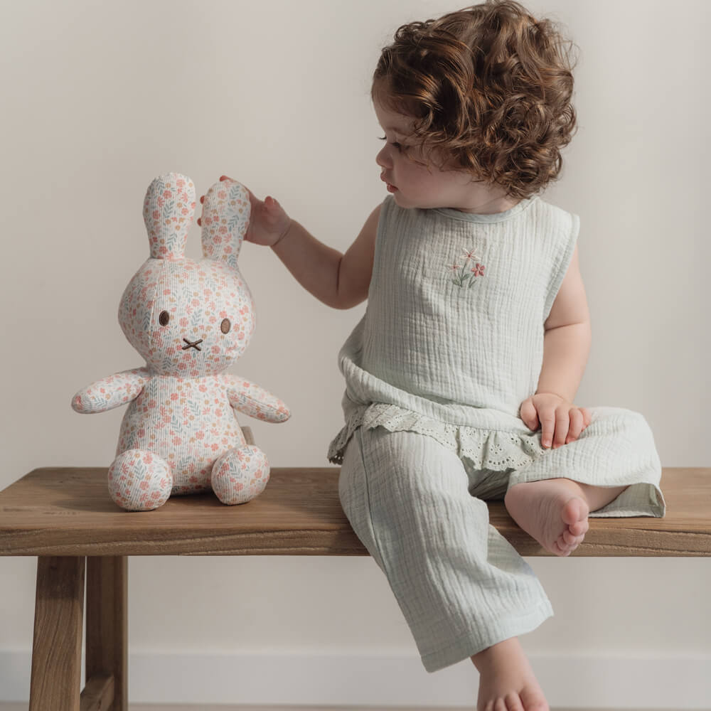 Cuddle Miffy and discover her new outfit! This sweet 30cm bunny is fully covered in the beautiful Lucky Blossom print designed by Little Dutch. She is made of soft plush and printed corduroy, perfect for cuddling while playing, on the go, or at bedtime. There is a playful bell in the cuddly toy. A wonderful addition to the baby room and friend for your little one!