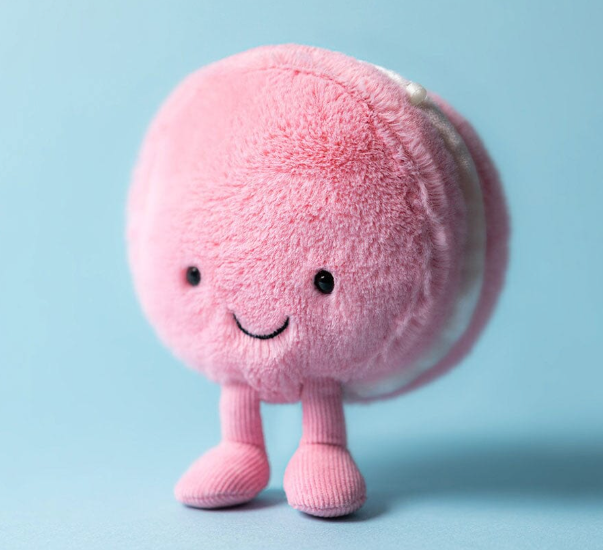 Amuseables Mia Macaron is a fruity, friendly treat in soft strawberry fur. With a velvety filling, matching cord feet, and stitched smile, Mia has an embroidered Jellycat logo on the back for a truly luxurious treat!