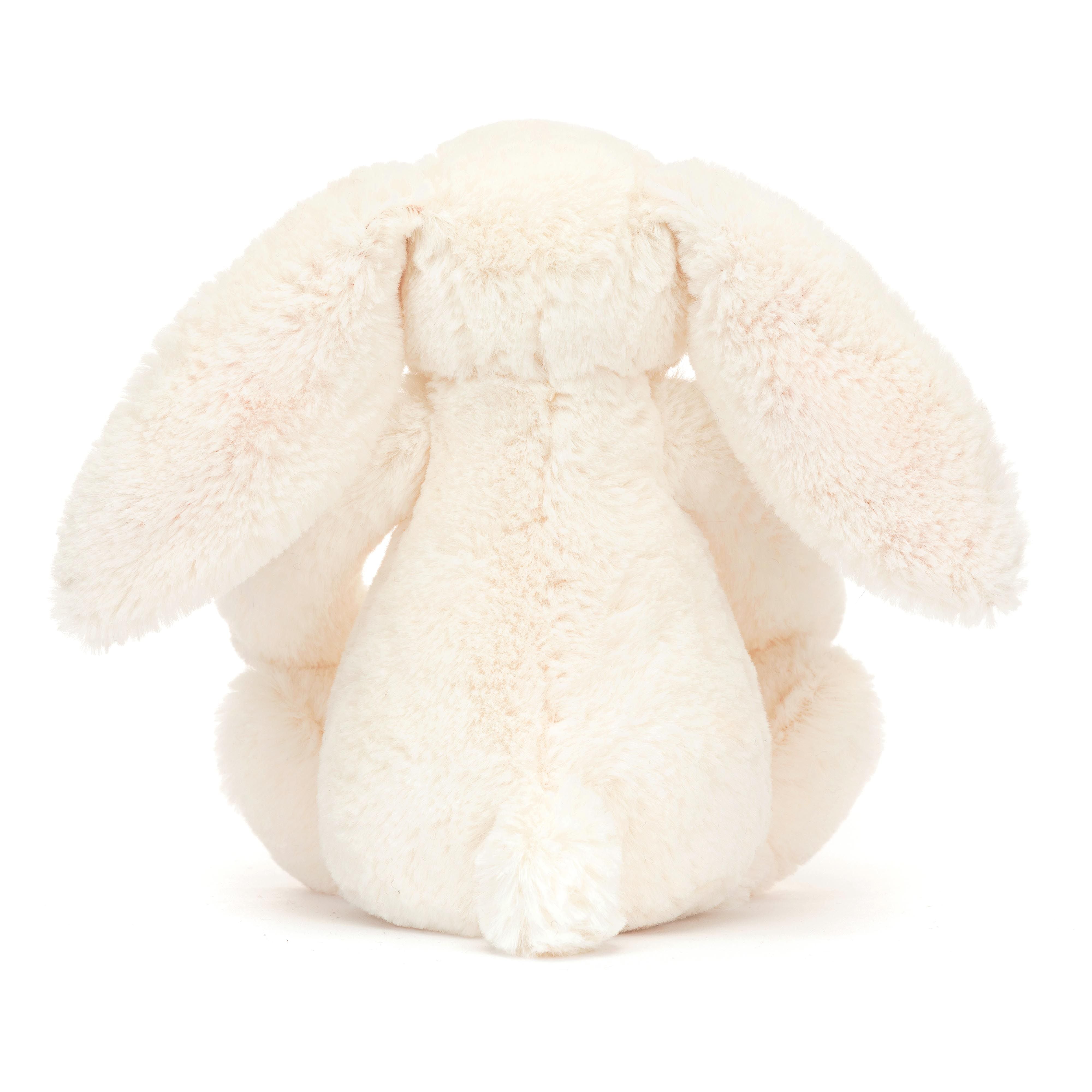 In iconic cream Bashful fur, Blossom Cream Bunny has soft cotton ears and feet, printed with an original Jellycat design of juicy strawberries and cream flowers on a pink backdrop.