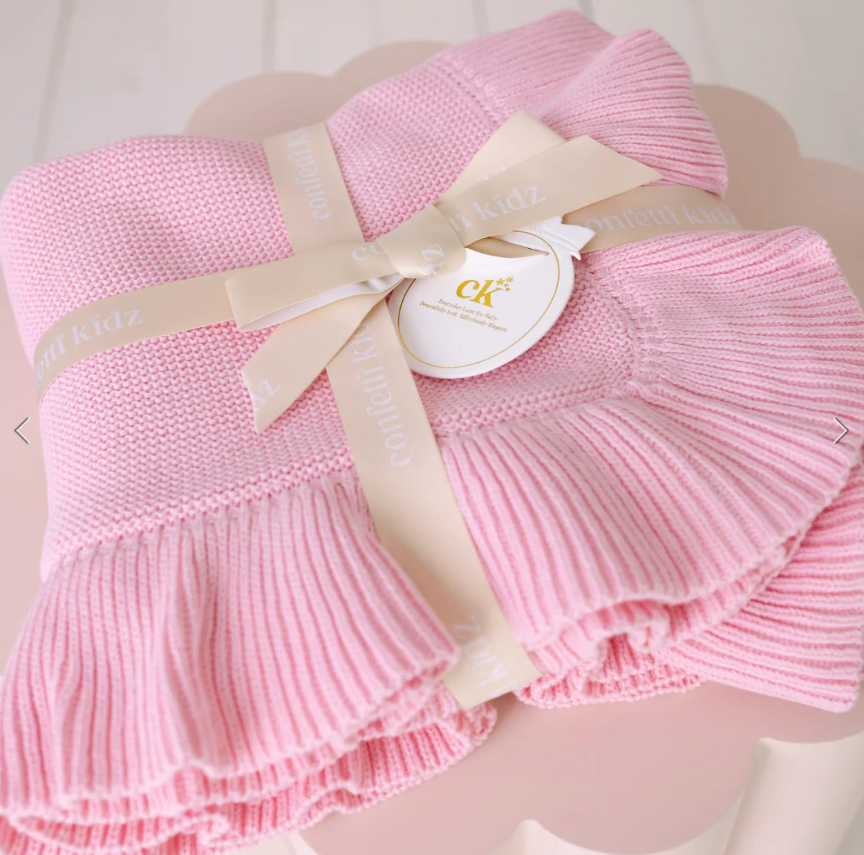 Finished with a delicate frilly trim, this blanket is perfect for milestone moments, special occasions, or as a timeless keepsake to cherish for years to come.