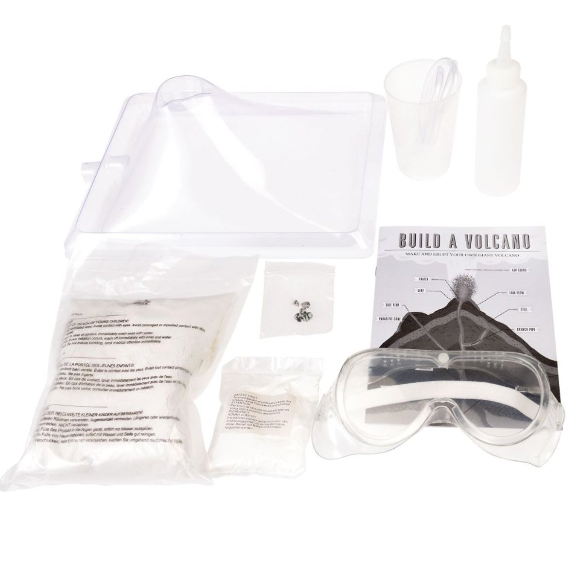 • Includes: Plastic mould, plaster mix, plastic bottle, plastic tubing, safety goggles, baking soda ‘eruption mix’, volcanic rocks and instructions