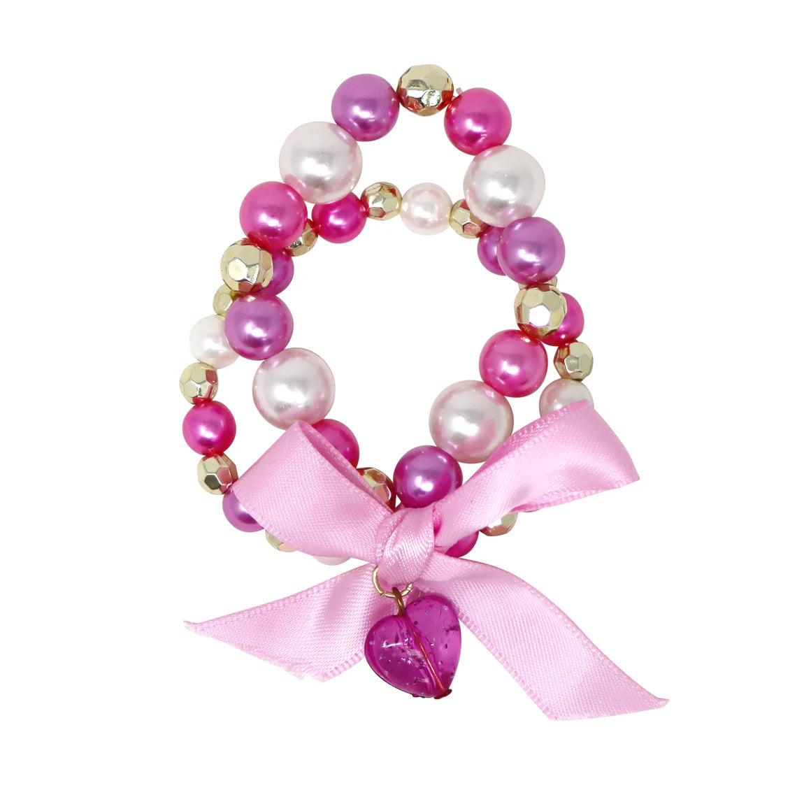 This sparkle princess pearl necklace features a glitter heart drop pendant topped with a satin bow. The 2 strand bracelet is made from alternating pearl and sparkle beads on stretch elastic for an easy fit. Available in colourways pink, lilac and light blue.
