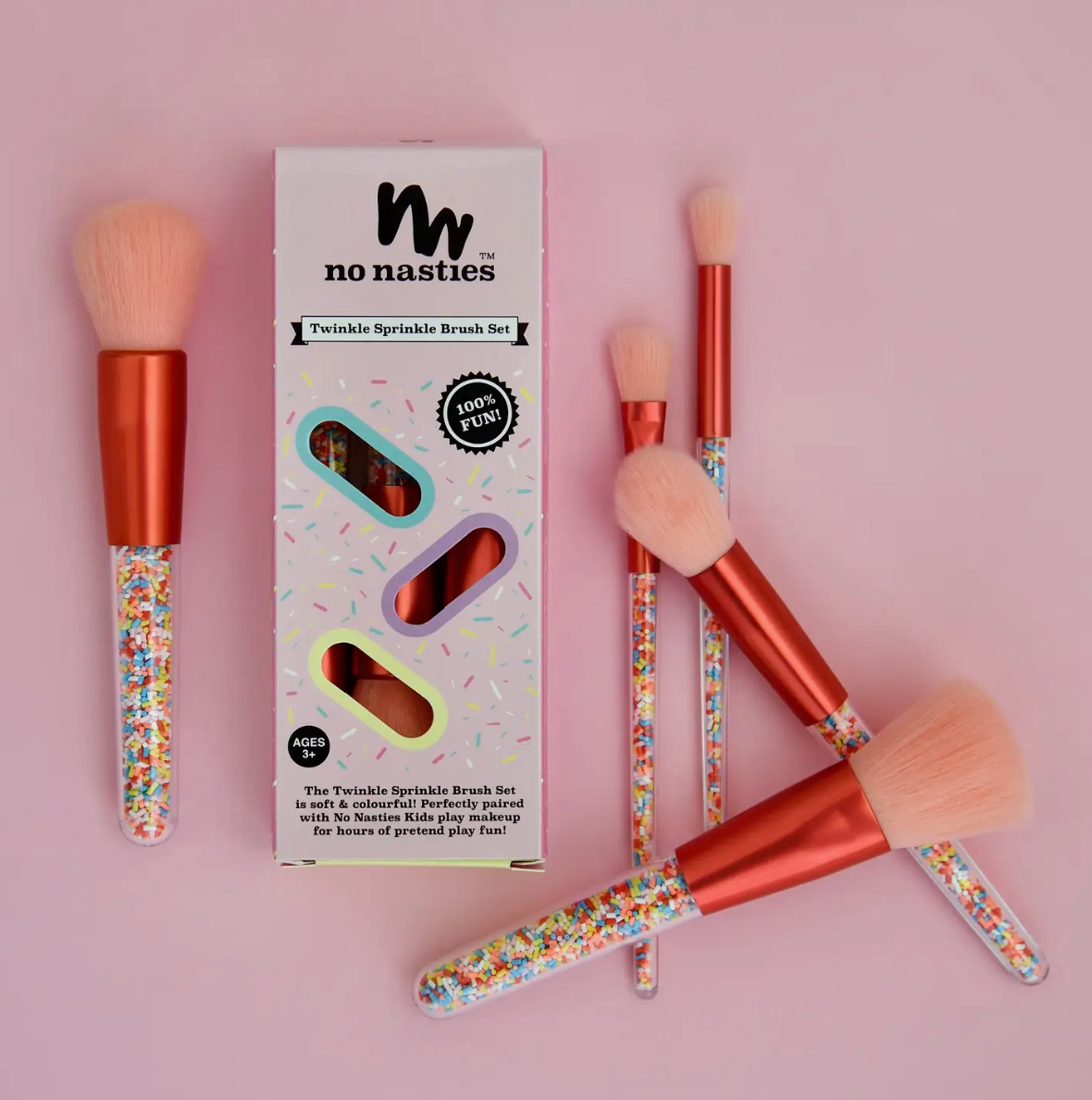 The twinkle sprinkle brush set includes 5 soft, hypoallergenic, vegan, and cruelty-free brushes. Sprinkle-filled handles make them bright, happy, and easy to spot under a pile of discarded toys.
