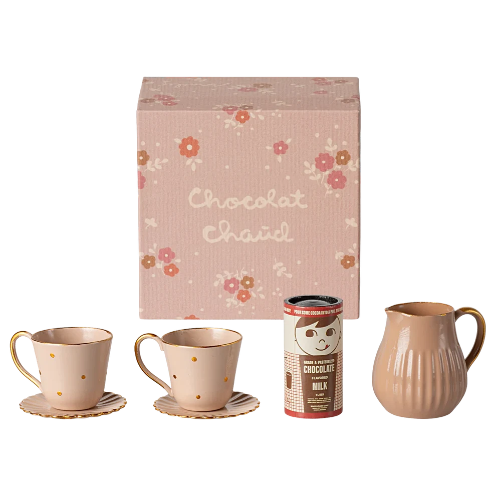 It is time to invite your Maileg friends over for hot chocolate. This set contains 2 cups, 2 plates, a pot and of course the hot chocolate.