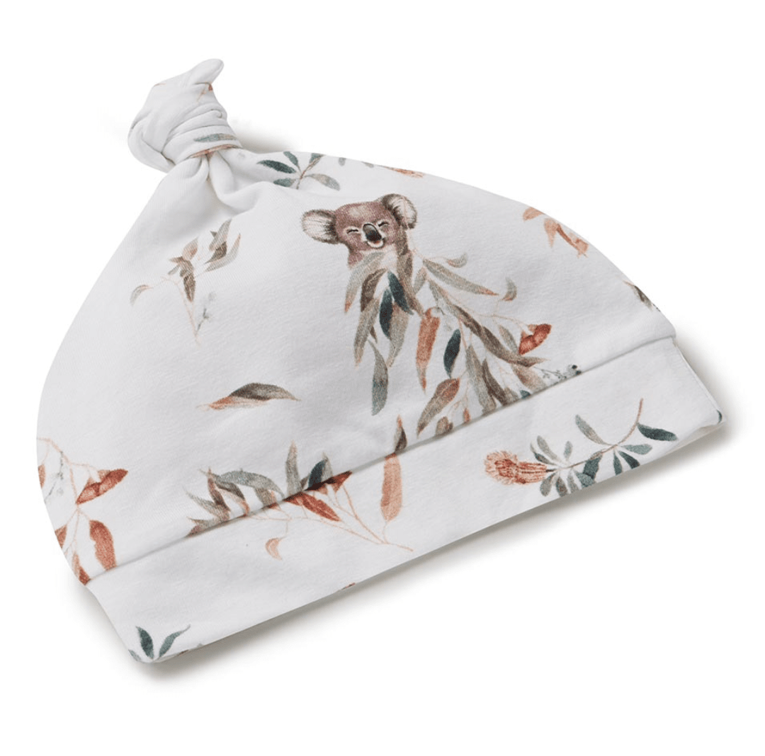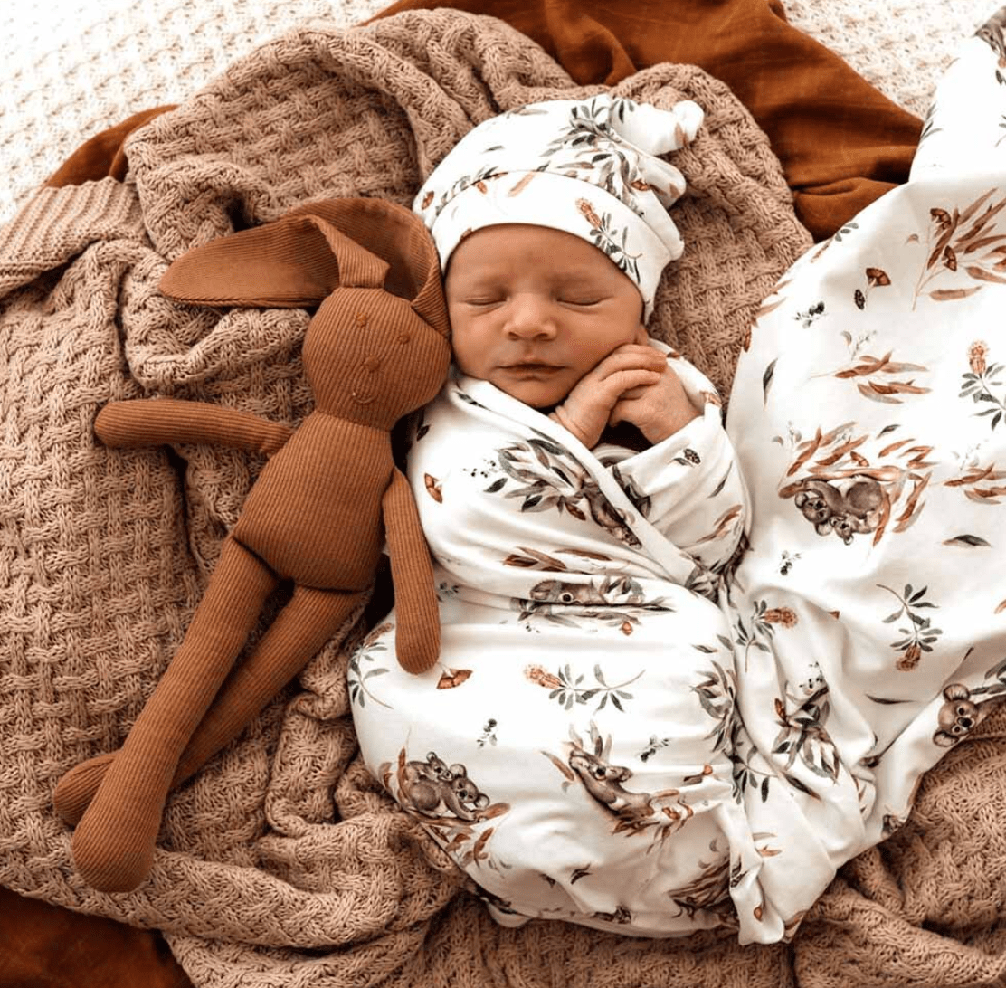 Our Snuggle Hunny organic cotton jersey wrap with matching beanie is soft, snuggly and stretches with baby. This wrap features our exclusive Snuggle Hunny Koala design and is made with GOTS Certified Organic cotton.