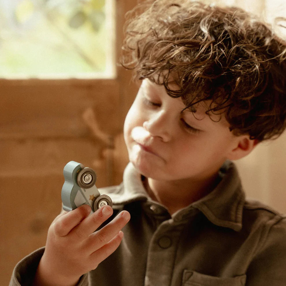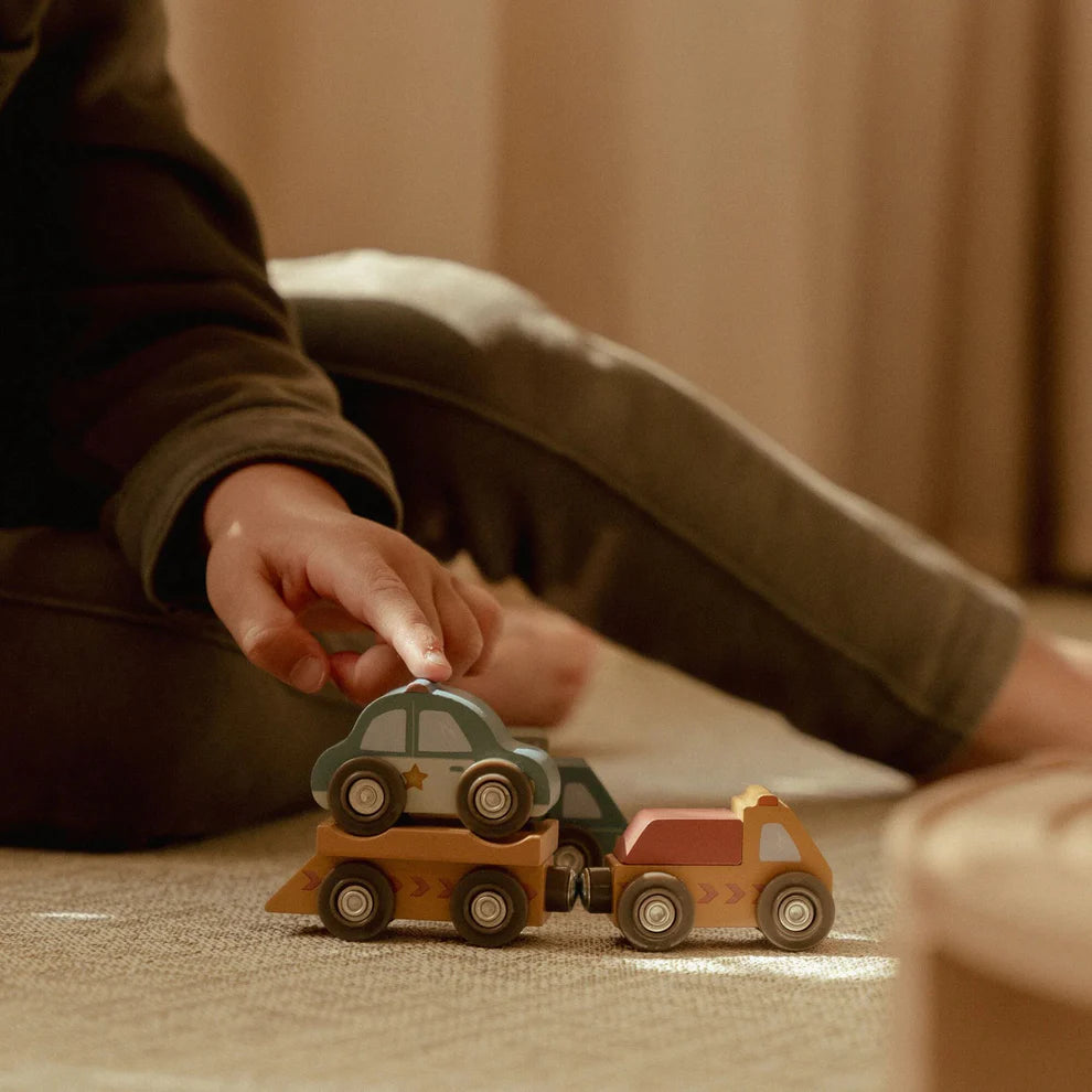 The city is always on the move! These wooden business and emergency vehicles are ready for action and smoothly ride the rails to provide help where needed. Send out the fire brigade, have the police patrol, or let the truck deliver goods. Combine and create your own adventurous city!