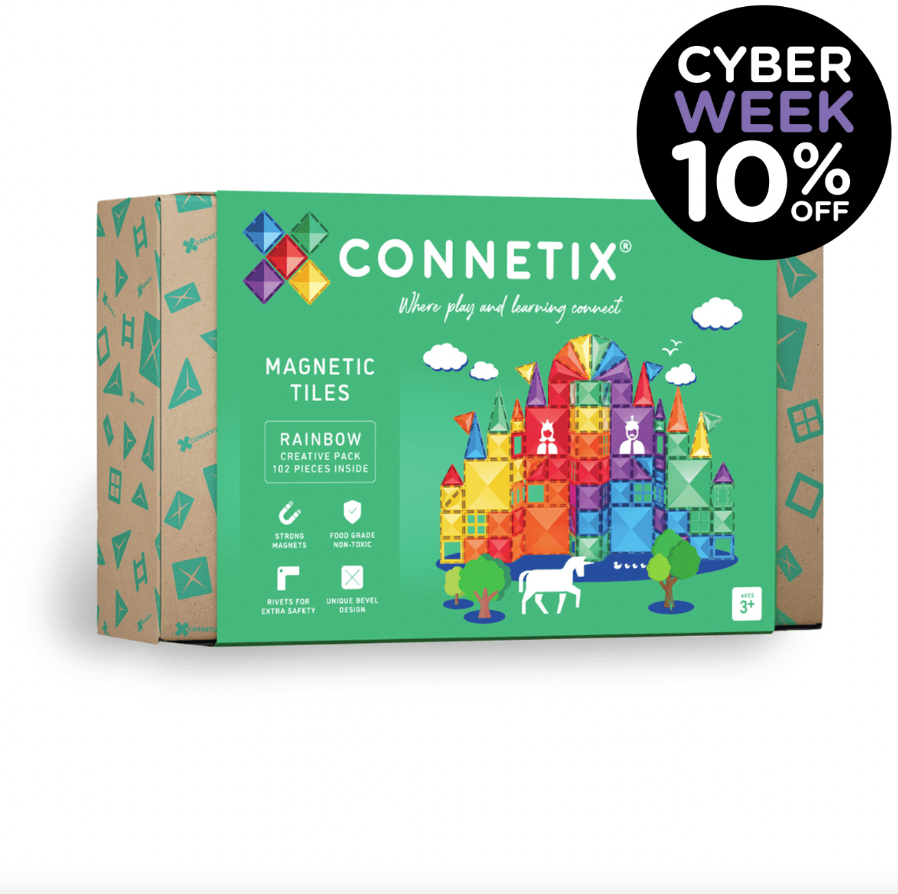 Bring imaginations to life and provide endless possibilities for creativity and learning through PLAY with our 102 Piece Rainbow Creative Pack. Featuring a variety of shapes including small and large squares, equilateral, right angle and isosceles triangles, plus fences, windows and door frames in every rainbow colour, this pack is perfect for family play and building BIGGER CONNETIX creations!