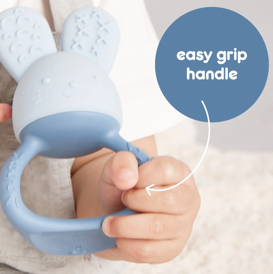 Introducing our chill + fill sensory teether. Offering a unique refillable teether to provide refreshing relief to teething tots from 3 months. Keep teether chilled in the fridge, then simply add an ice cube and cold water for cooling relief to inflamed, achy baby gums. Soft, food grade silicone bunny head and ears reach all areas of mouth safely.