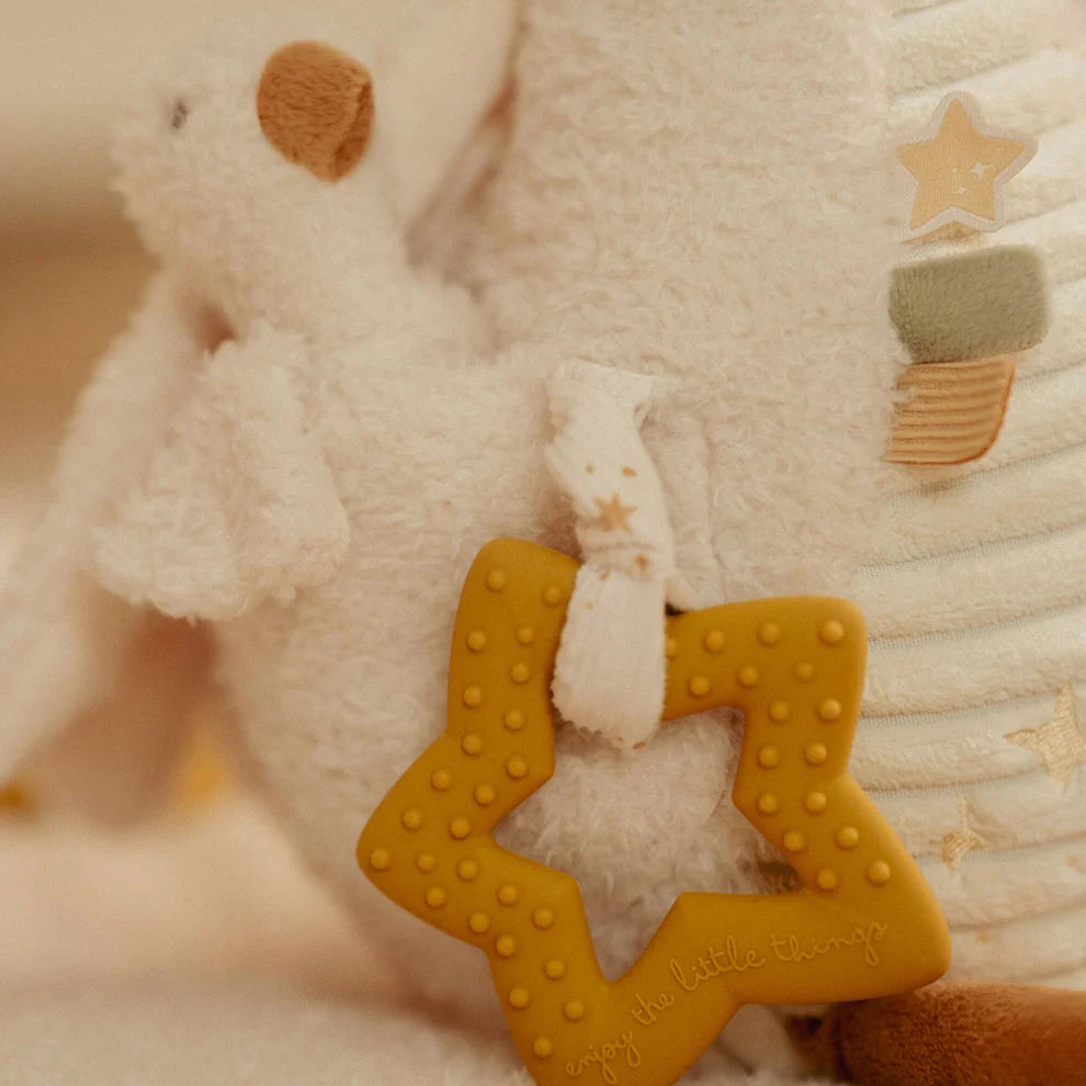 Meet Little Goose, ready to explore the world with your little one! This sweet activity toy invites babies to discover through touch, sound, and movement. Made with soft fabrics and various features such as a baby goose under it’s wing, a plastic mirror and teething star, it’s designed for cuddling, grabbing, and curious play. Soft fabric labels add extra details to explore, while the compact size makes it easy for tiny hands to hold. A comforting companion that supports early development and turns every moment into a small adventure.