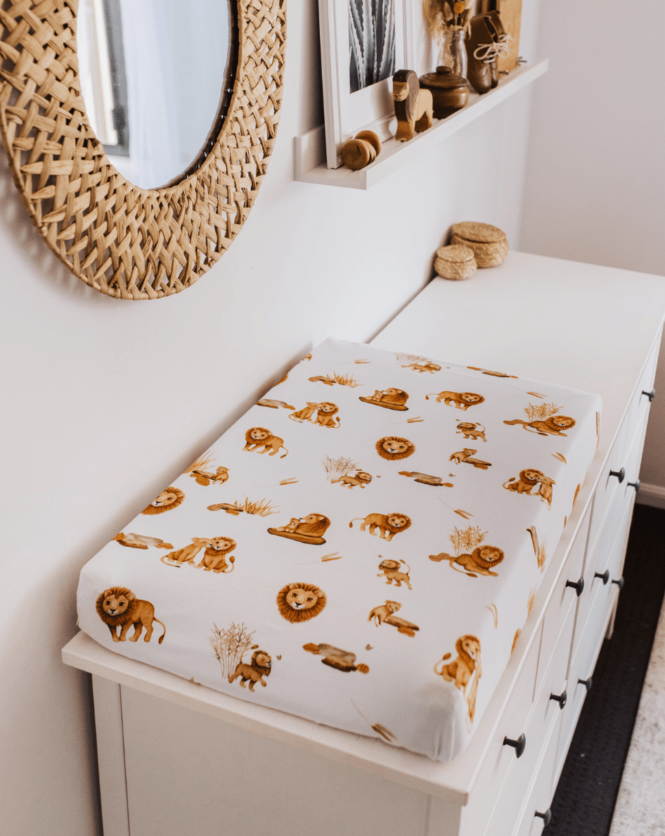 Our Lion Fitted Bassinet Sheet can also be used as a Change Pad Cover and is made from snuggly soft stretch cotton jersey. Comes with a matching drawstring bag which can be used for other multi-purposes.