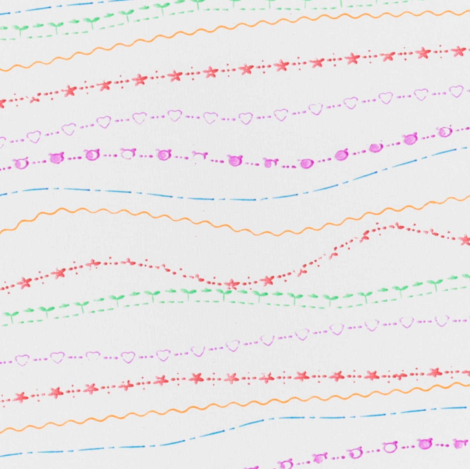 • Patterns include stars, hearts, plants, dashes, wiggle and bear