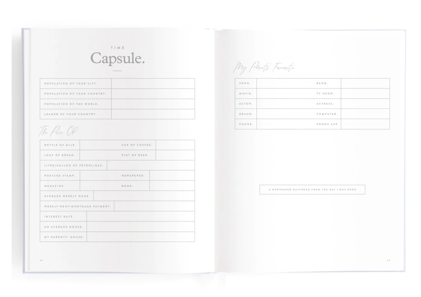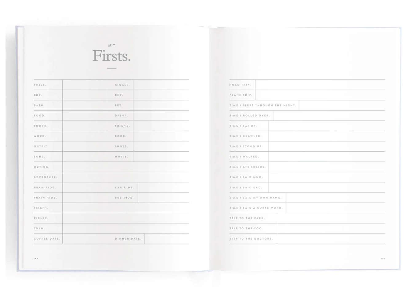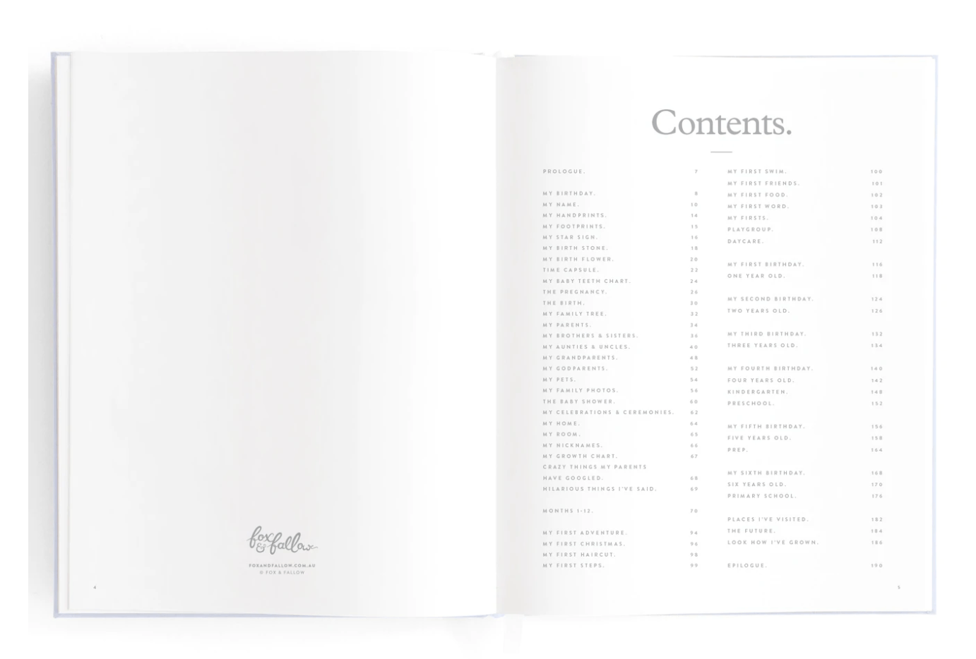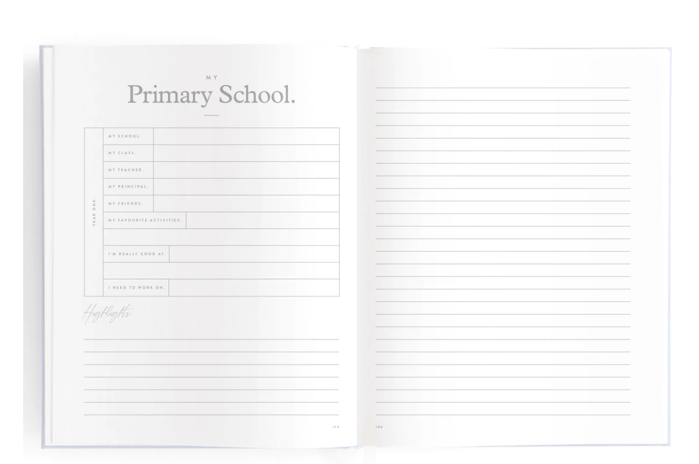 A beautiful keepsake for the whole family to enjoy. Includes: important milestones and firsts, family profiles, family tree and travel map, playgroup and daycare through to kindy and school years, time capsule, nicknames and celebrations, pets, friends, birthdays and more. 190 pages.