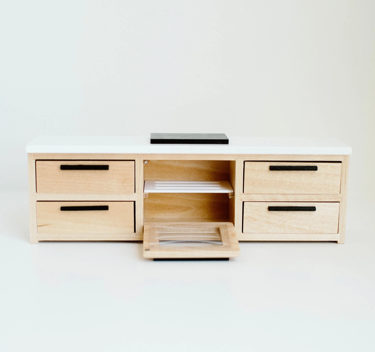 Our Dollhouse Kitchen Base Cabinets with Cooktop and Stove feature a realistic and modern design that mirrors contemporary kitchen aesthetics.