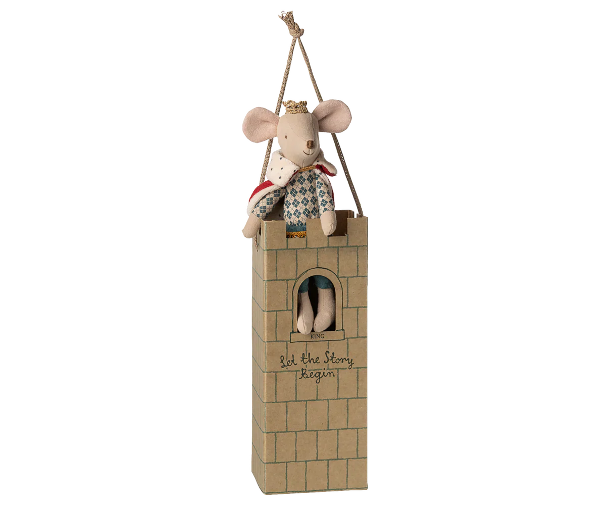 All rise for His Majesty! The Maileg King Mouse Dad brings regal charm and timeless elegance to the Maileg royal family. Dressed in detailed harlequin-style top, deep teal trousers, a plush faux-fur-trimmed cloak and a golden crown, he exudes gentle authority and warmth.