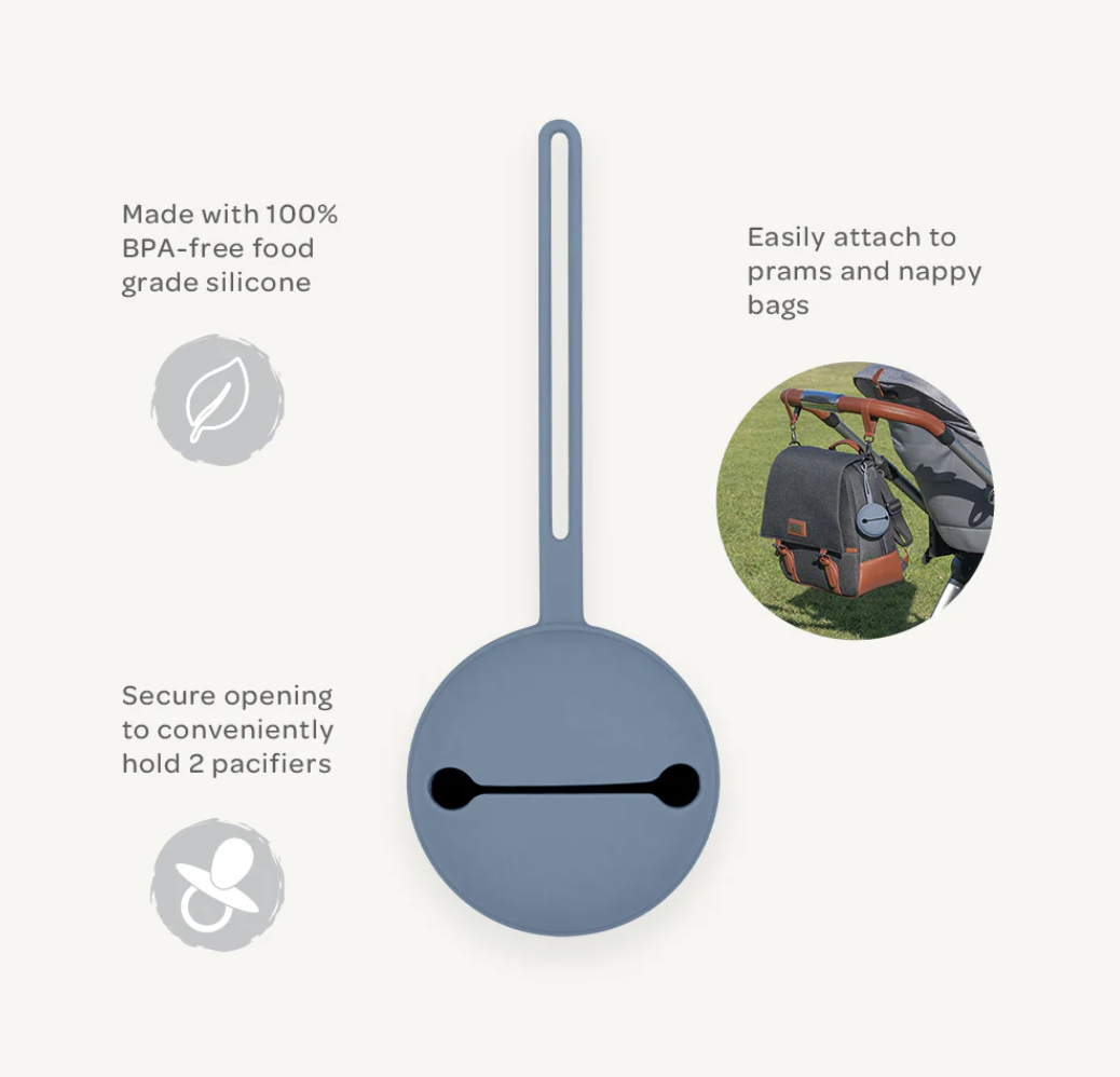 Extra pacifiers will always be kept clean and within arm’s reach with this handy portable pacifier case. Made from BPA-free, food grade silicone this case easily loops on to nappy bags, prams and bumper bars.