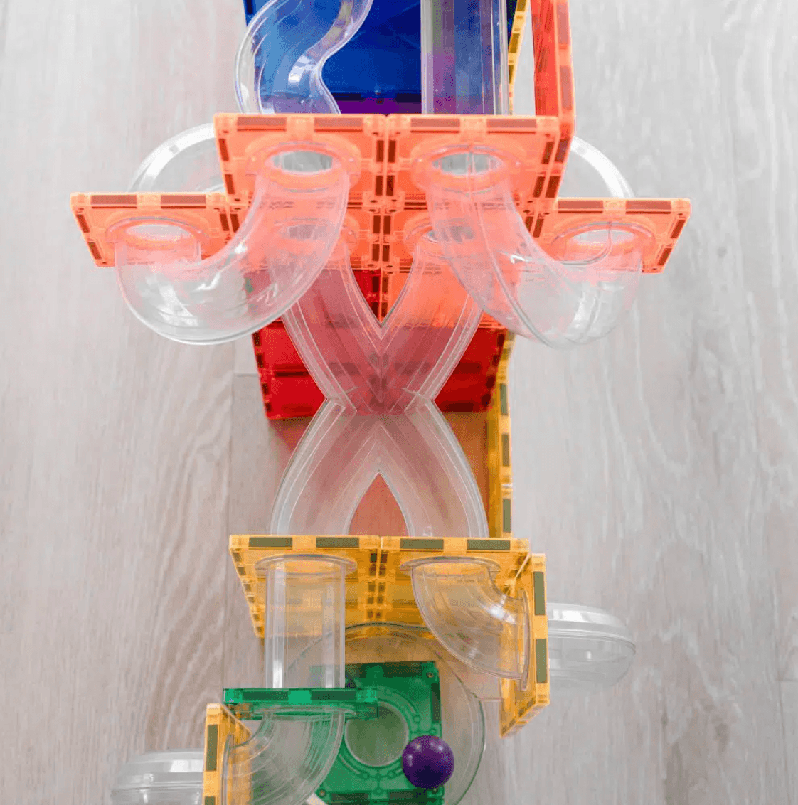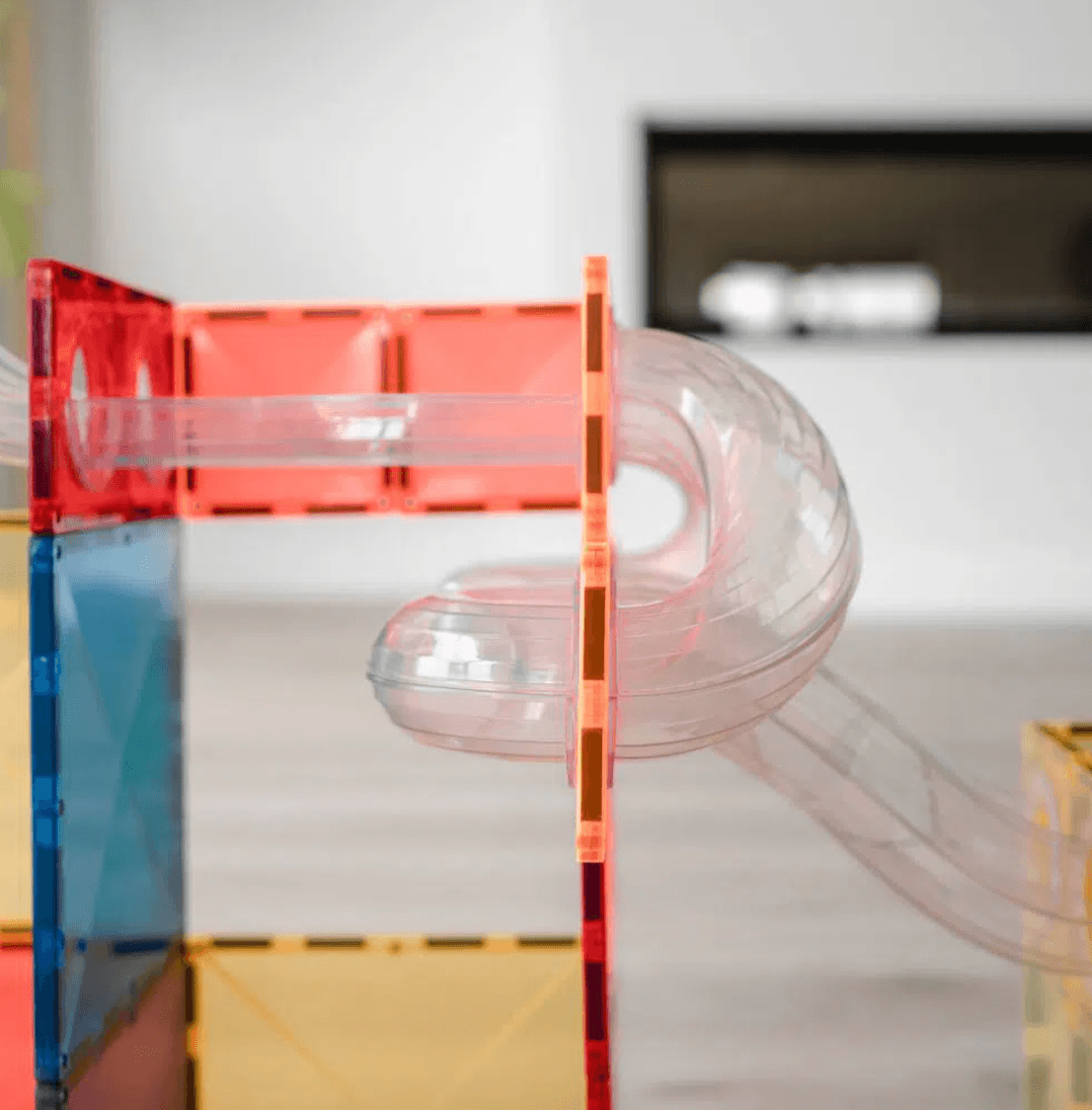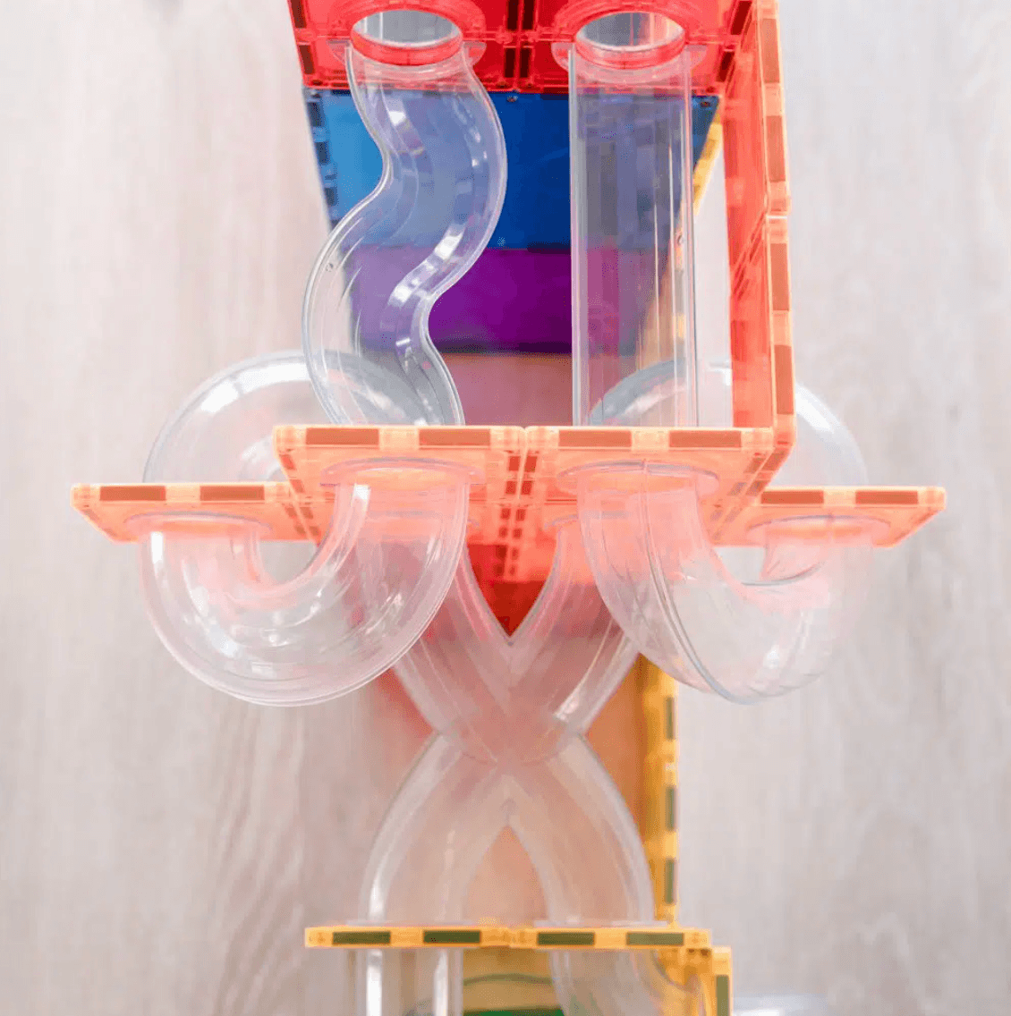 This open-ended expansion pack includes connector square magnetic tiles, wooden balls plus a range of clear, fluted tubes to allow you to explore motion and gravity like never before – an X-shape to re-direct and pivot the action, double-entry bowls for new ways to collaboratively play and race, spiral pieces for eye tracking fun, plus 1/2 and 1/4 pieces for twists and turns.