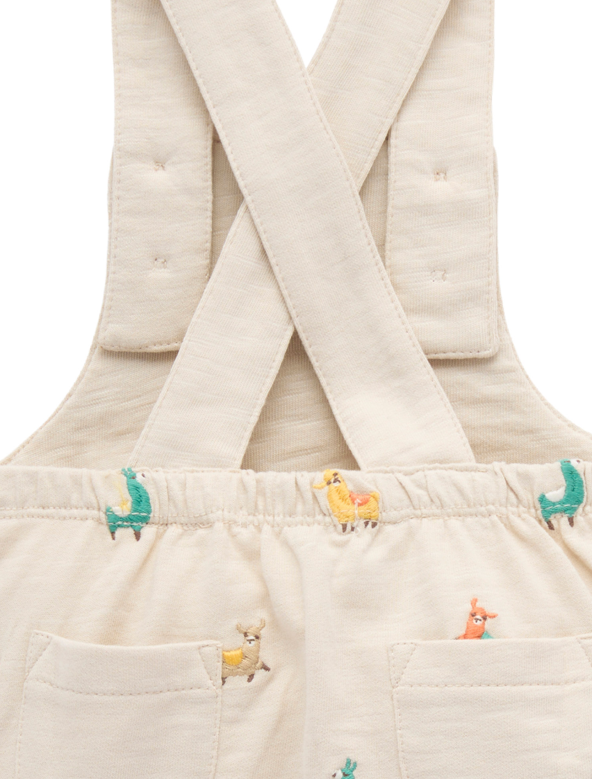 All over llama embroidery Wood look buttons Adjustable cross over straps Rolled up cuffs Made from 100% Organic Cotton