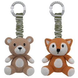 Keep baby entertained when out and about with our sweet bear and fox stroller toys. Made from 100% cotton knit and featuring a soft jingling rattling, they attach easily to any stroller/pram hood, bumper bar, or even baby's play-gym or car seat.
