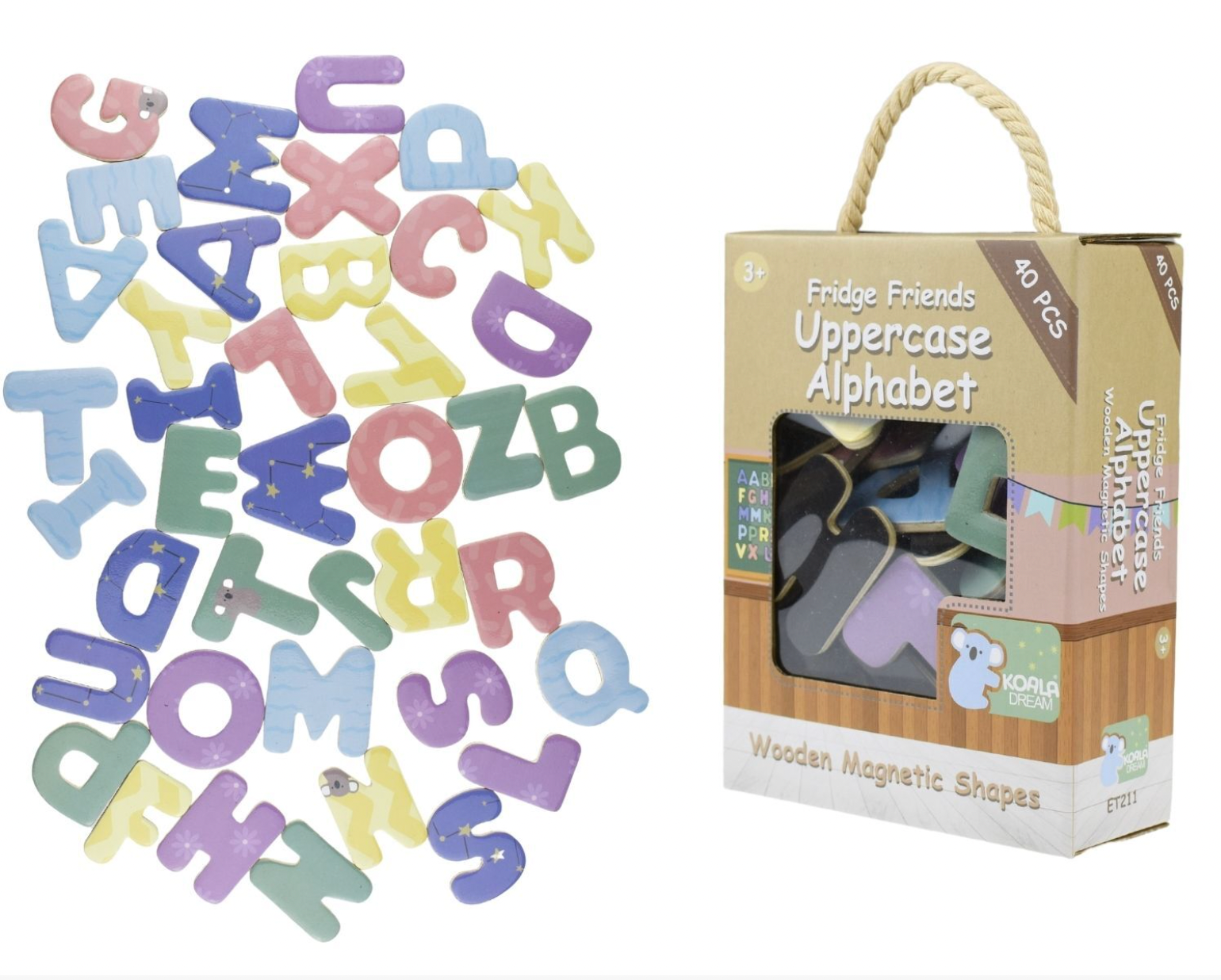 The Fridge Friends Magnetic Alphabet Uppercase by Koala Dream is an exceptional educational tool designed to make learning fun and engaging for children. This set includes a total of 40 vibrant uppercase letters, turning any magnetic surface into a captivating learning space. Safety is a top priority, and parents can rest easy knowing that these magnets are child-safe and non-toxic. Crafted with durable materials, they are built to withstand the rigors of enthusiastic play, ensuring long-lasting use. The magnetic alphabet set serves as a powerful tool for early literacy development. Children can arrange the letters on the fridge or a magnetic board to create words, practice spelling, and enhance their letter recognition skills. It's an excellent way to introduce kids to the wonders of language in a tactile and interactive manner. With its appealing design and educational benefits, the Koala Dream Fridge Friends Magnetic Alphabet Uppercase is the perfect addition to any home or classroom, fostering a love for learning while ensuring the safety and well-being of young learners.