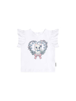 Super soft, premium organic cotton jersey frill sleeve t-shirt with meow meow print